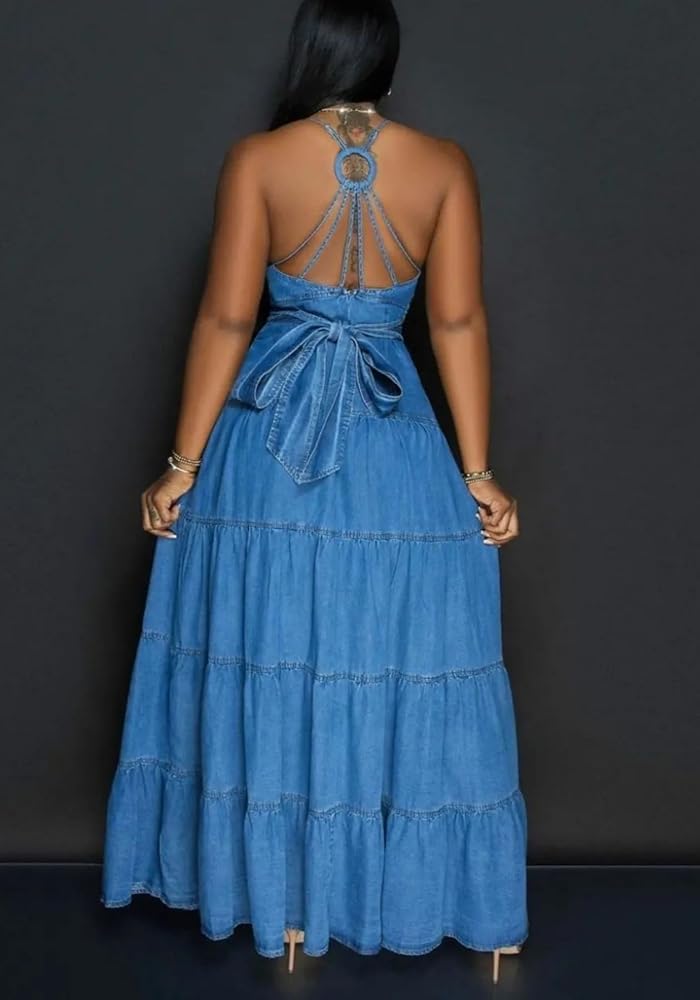 تصميم أنيق وكلاسيكي: فستان طويل فضفاض ومثير، بدون أكمام، أشرطة كتف رفيعة، فستان طويل لطيف بأكتاف مفتوحة، فستان صيفي مريح بدون ظهر، فستان بطول الكاحل، طول الساق، لون موحد، فساتين طويلة من الدنيم للنساء