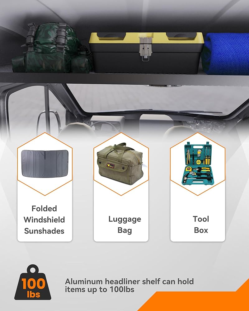 زيادة المساحة: أرفف بطانة السقف مصنوعة من مادة الألومنيوم، مما يوفر قوة ومتانة عالية، ويمكنها حمل أشياء مختلفة، مثل مظلة الزجاج الأمامي المطوية، وحقيبة الأمتعة، وصندوق الأدوات وغيرها من المتعلقات الشخصية.