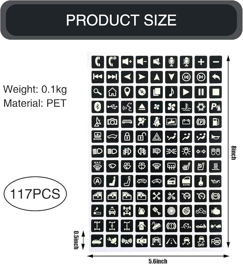 Package Contents: You will receive a luminous sticker for the car panel buttons, corresponding to 117 buttons. If you have any questions about the product, you can contact us in time and we will try our best to solve the problem for you.