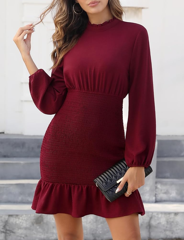• Features: Fall dresses for women 2023, fall outfits, long sleeve dress for women, solid dress for women, smocked bodycon dress for party, ruffle dress women for work business, short dress above knee length, long sleeve high waist mini dress.