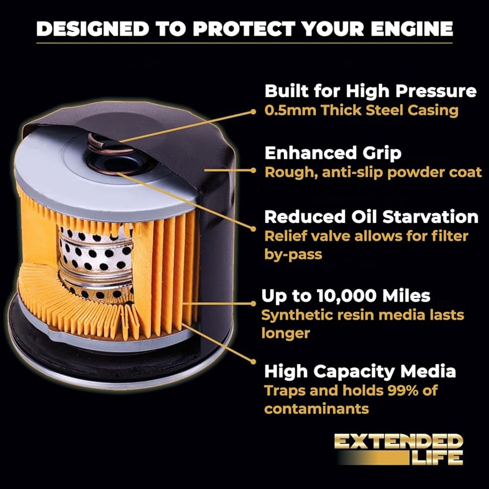 - Extended life filtration media engineered to deliver up to 10,000 miles of engine protection