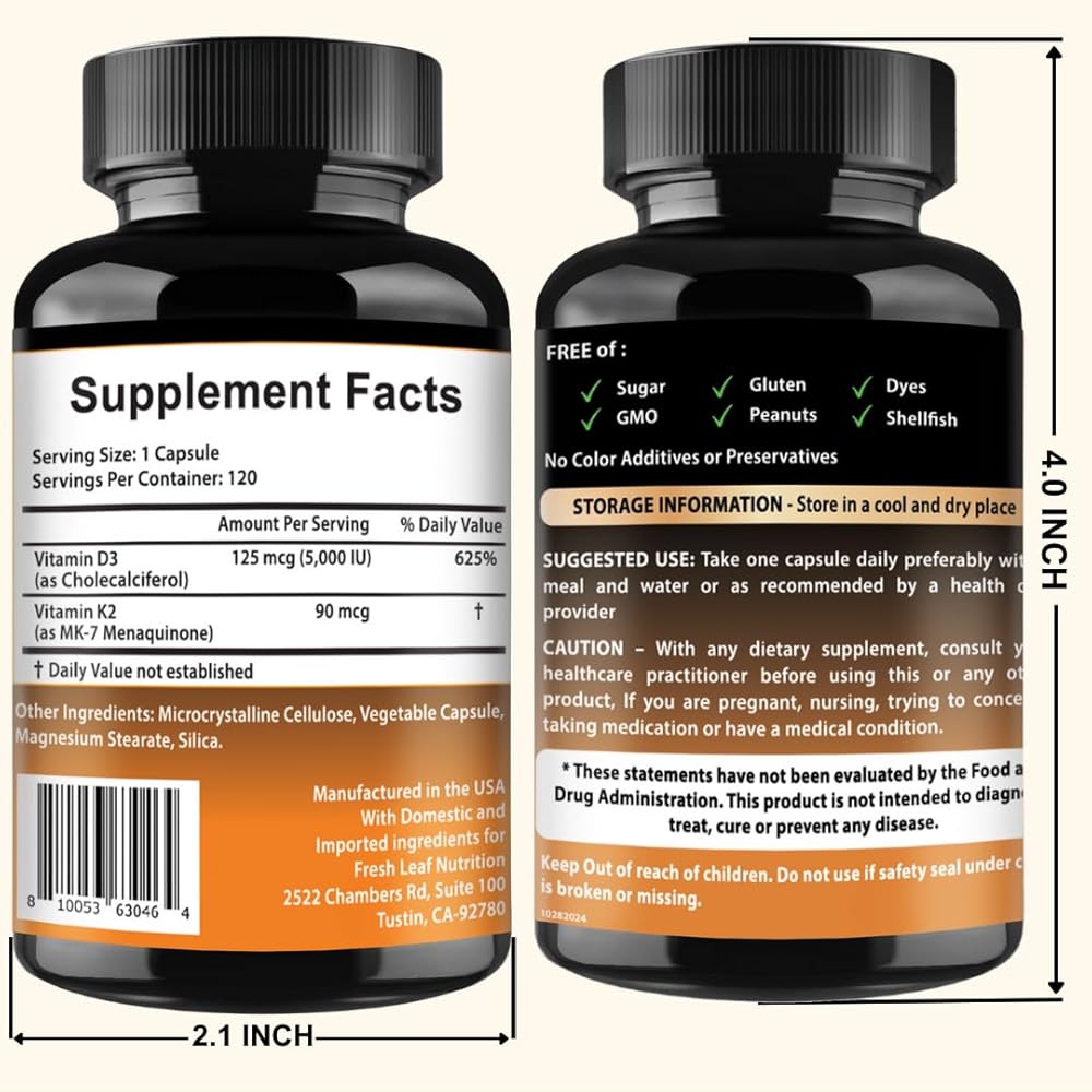 الامتصاص المعزز: تم تصميم فيتامين D3 وK2 للعمل معًا، ويحتاج فيتامين D إلى فيتامين K2 لتحقيق أقصى قدر من الامتصاص والفوائد. في حين أن فيتامين D3 يدعم الصحة العامة، فإن فيتامين K2 يضمن لك الحصول على أقصى استفادة منه لتعزيز الفوائد الصحية. يتكون مكمل فيتامين د3 ك2 من 5000 وحدة دولية من فيتامين د3 و90 ميكروجرام من فيتامين ك2. - يتضمن كمية كافية لمدة 120 يومًا