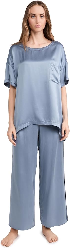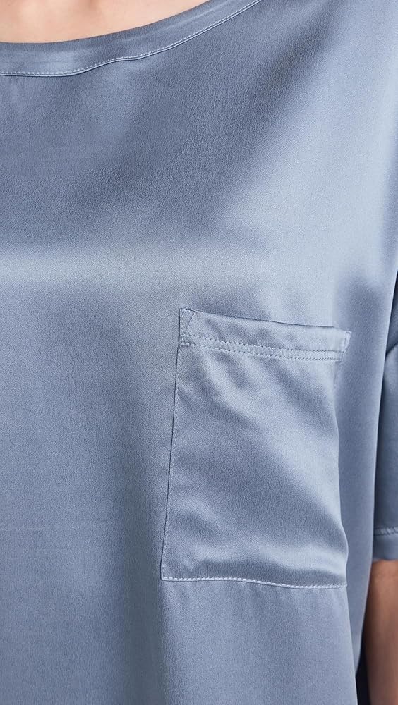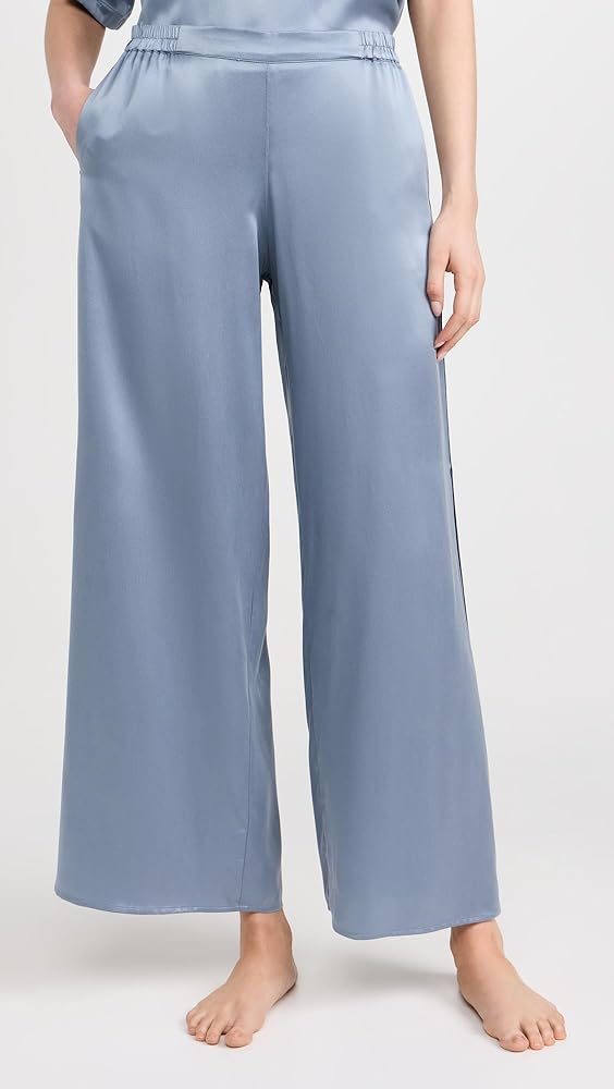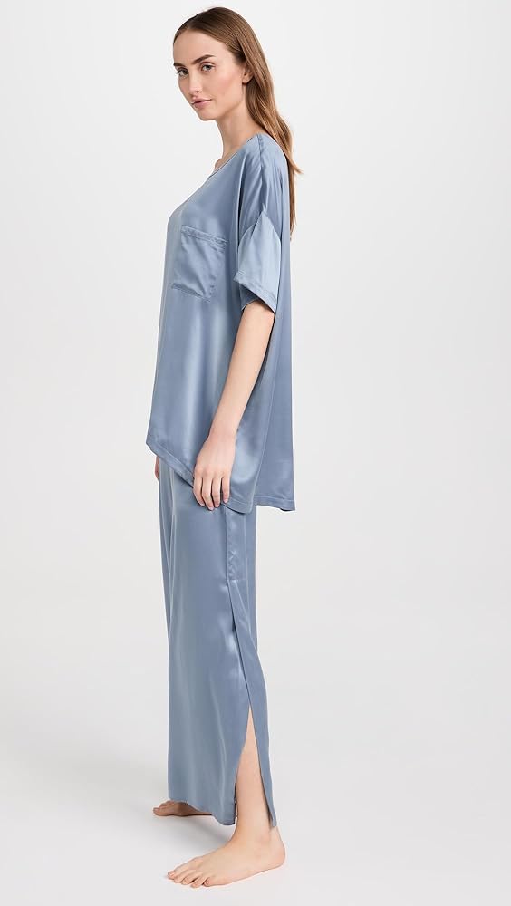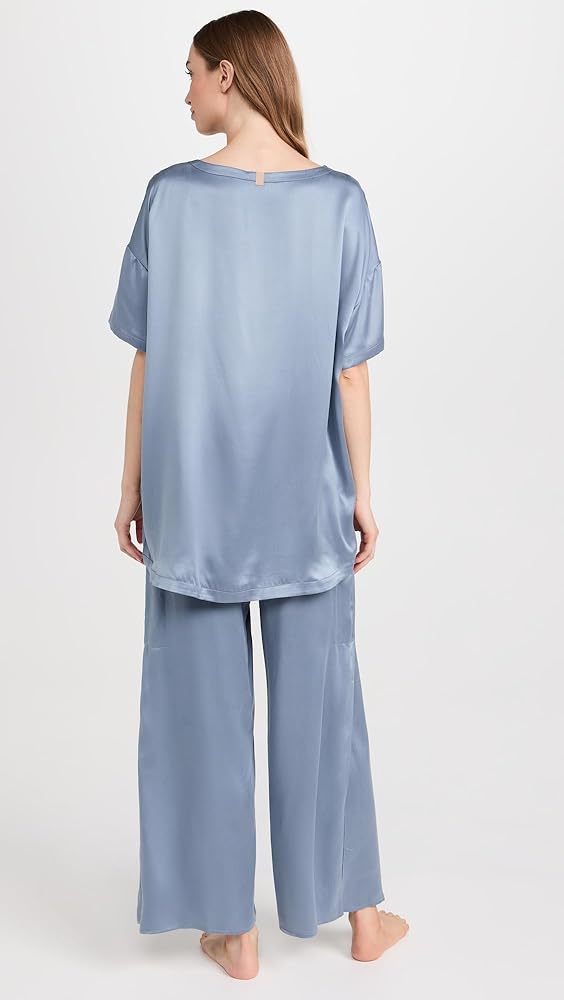 - مصنوع من حرير التوت عالي الجودة الذي يمتص الرطوبة بشكل طبيعي وينظم الحرارة، وصبغات معتمدة باللون الأزرق، وقصة واسعة الساق مع أطراف أكمام مقسمة.