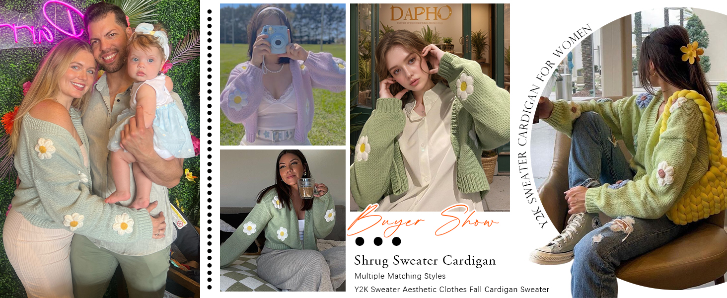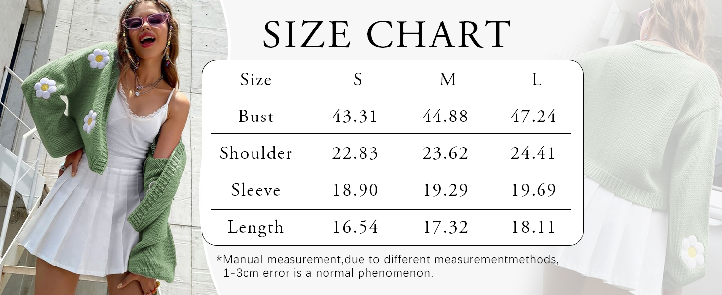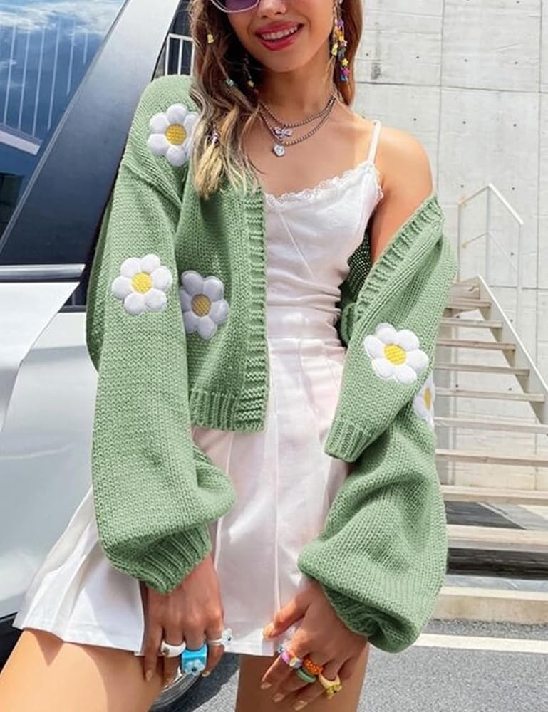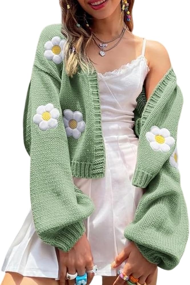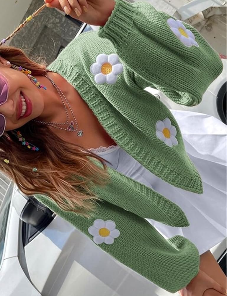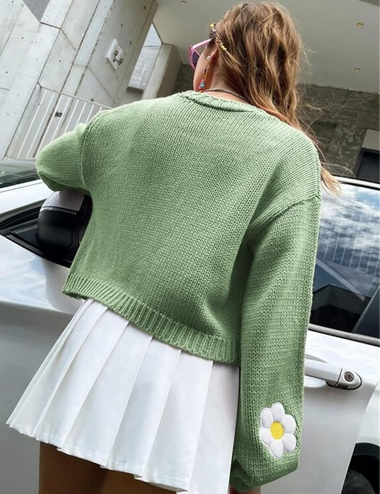 سترة نسائية Y2K Flower كارديجان مقصوصة لطيفة من نسيج Kawaii بأكمام طويلة مفتوحة من الأمام ومن الخلف إلى ملابس الكلية (أخضر-M)