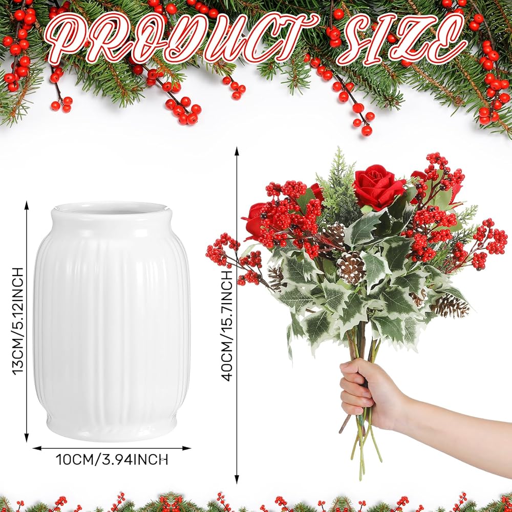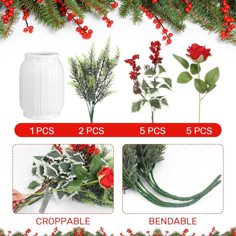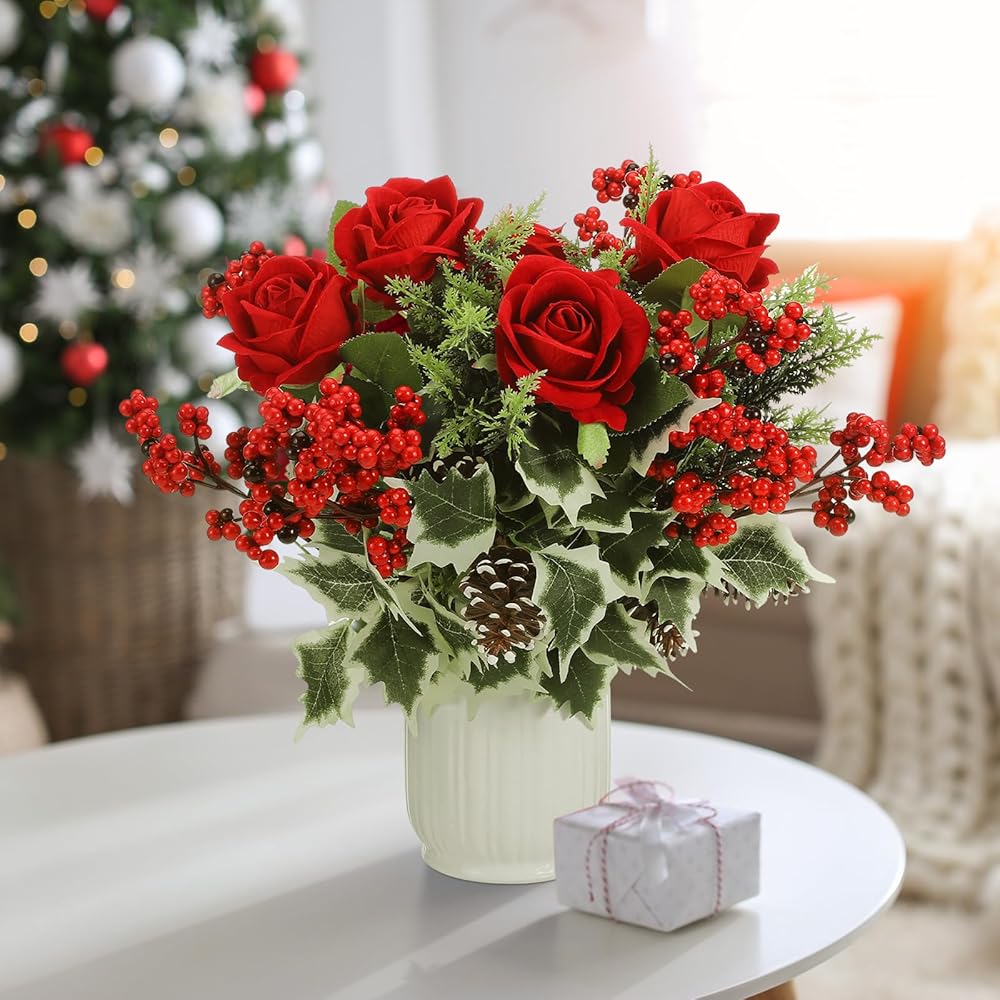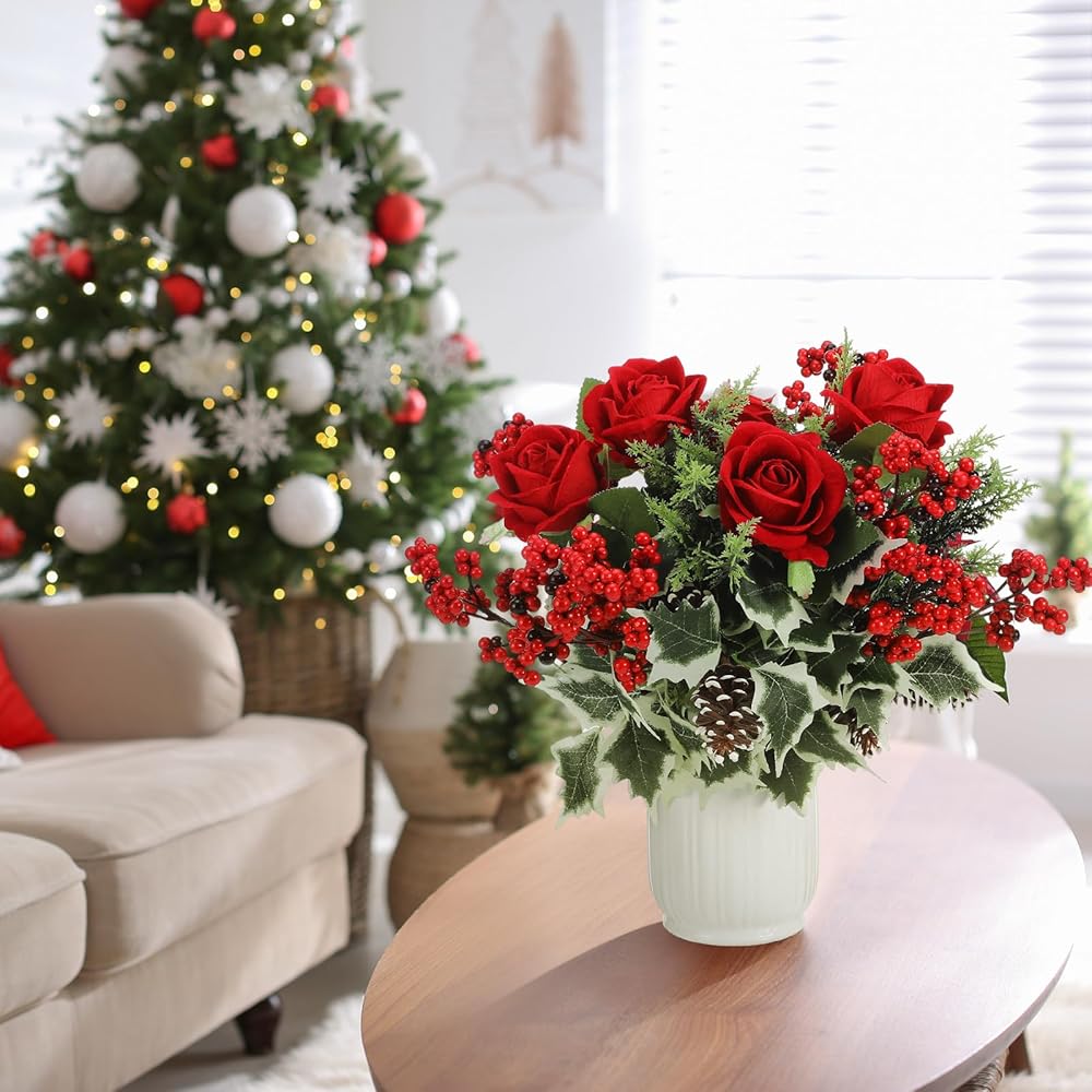 The red, green, and white colors of the flowers, leaves, berries and vase beautifully portray the charisma of Christmas, making your holiday decorations effortlessly vibrant and inviting.