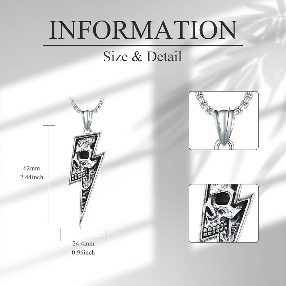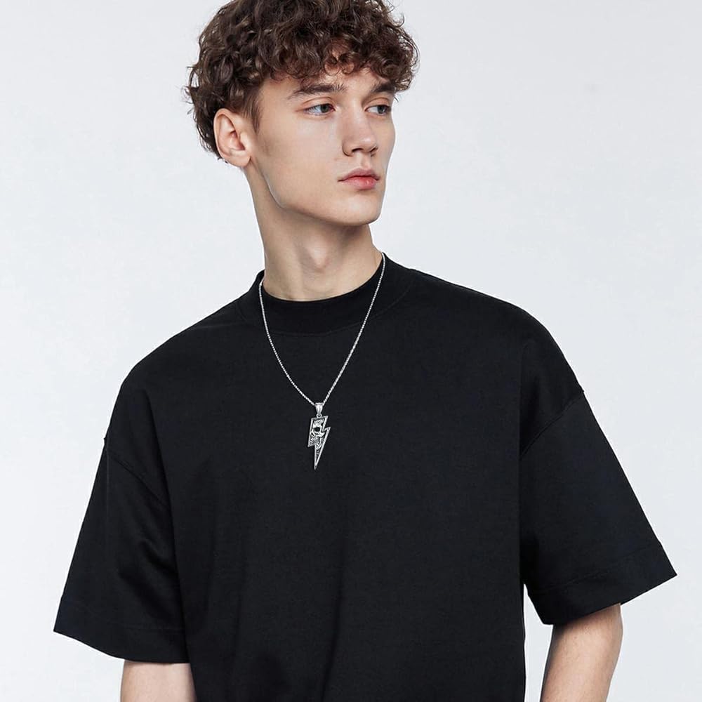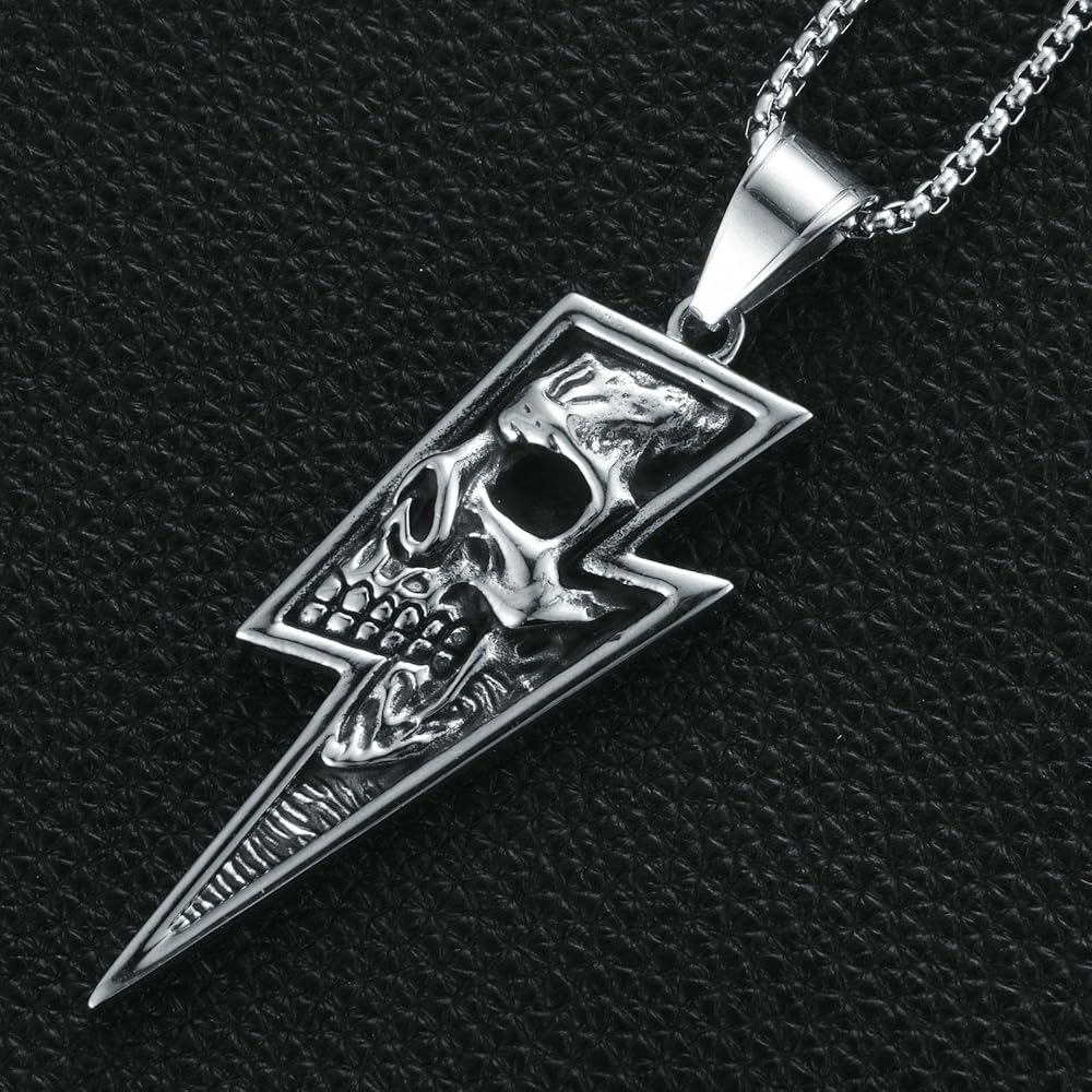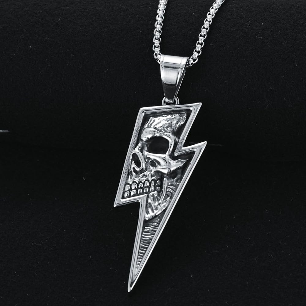 【الخامة: قلادة جمجمة لايتنينج مصنوعة من الفولاذ المقاوم للصدأ 316L، مضادة للأكسدة، قوية، خالية من الرصاص، خالية من النيكل، ليس من السهل تغيير اللون، ولن تسبب حساسية للبشرة.