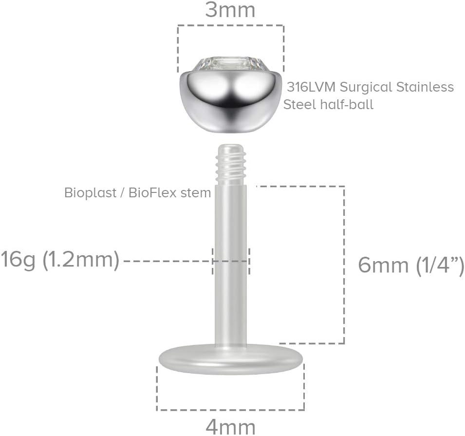 SPECIFICATIONS - Crystal: 4 x Cubic Zirconia Crystal gems that sparkle, glitter and are cute and pretty (no fogginess). Length: 6mm. Gauge: 16g. Ball End: Halfball 3mm. These bioflex labret 16g are designed and tested for quality. Get the most out of your piercing with these bioplast labret 16g