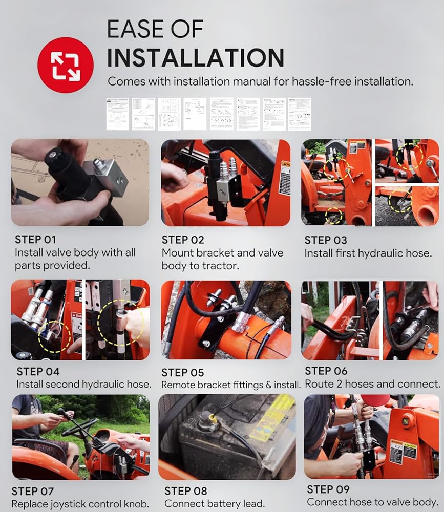 • 【Poweful Functions】3rd function valve kit is powered by the power beyond port of your existing loader valve which will allow you to use multiple functions at the same time, such as curl bucket and close grapple.