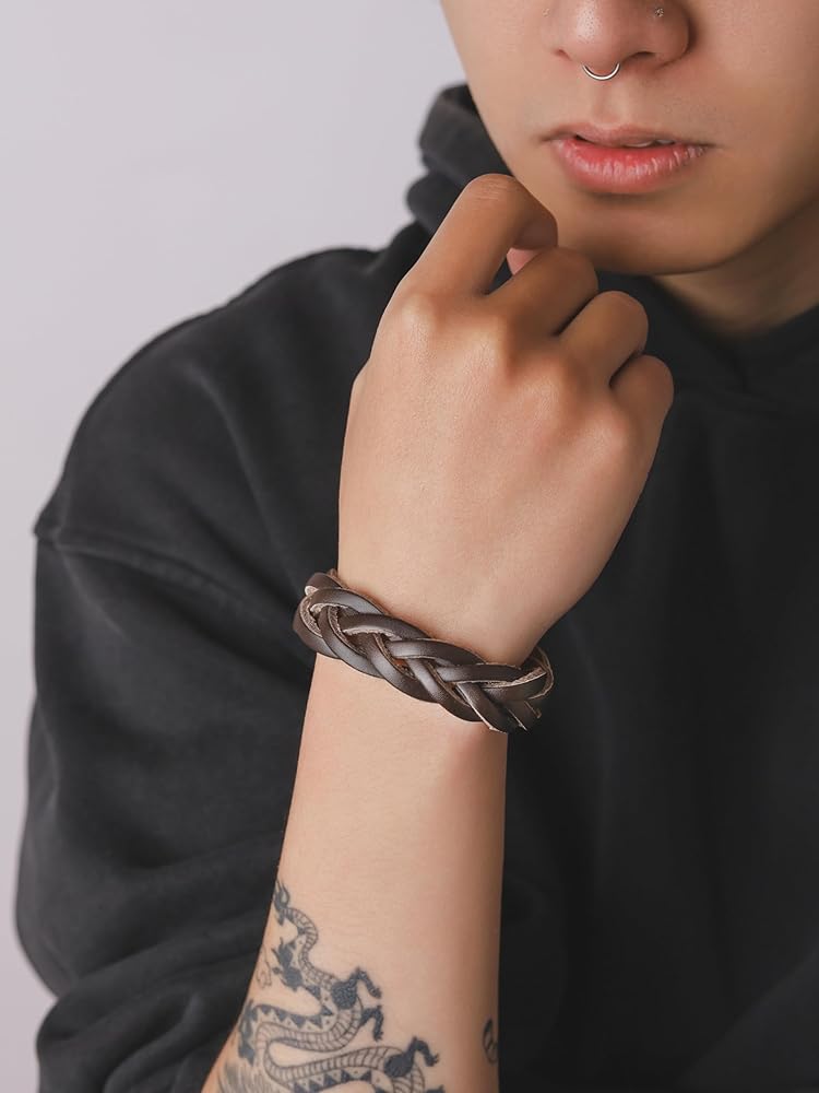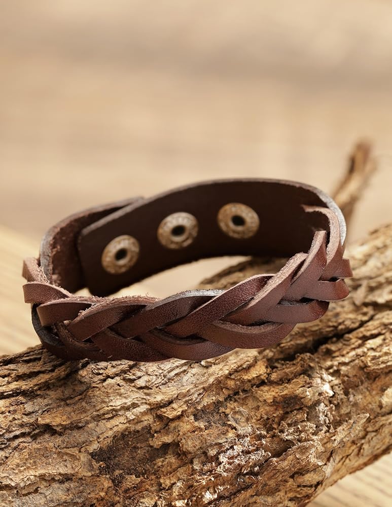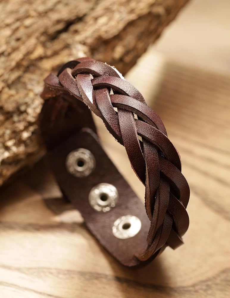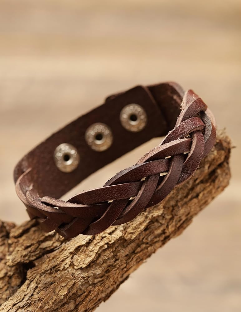 سحر ريفي: احتضن الجمال القوي مع سوار HAQUIL المصنوع من الجلد البني المضفر، والذي يتميز بأزرار كبس فضية مميزة لإضفاء مظهر عتيق.