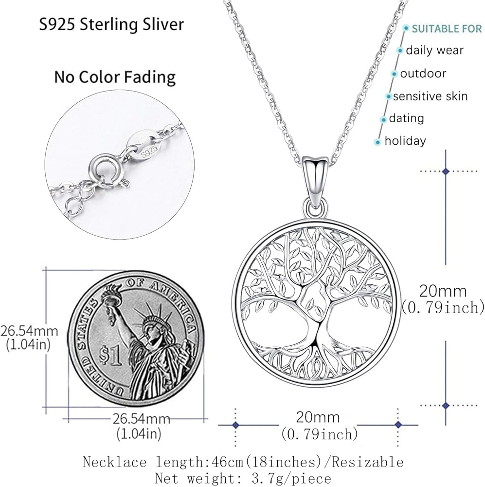 تصميم رائع وتصميم أصلي - يبلغ قطر قلادة شجرة الحياة الدائرية 0.79 × 0.79 بوصة. شجرة الحياة تنضح بحيوية قوية. عندما تتأرجح القلادة، ستتألق قلادة الفضة الإسترلينية. يمكنك بالفعل ارتداء هذه القلادة بحيث تكون الجوانب متجهة للخارج، حيث أن كلاهما لهما أنماط فريدة.