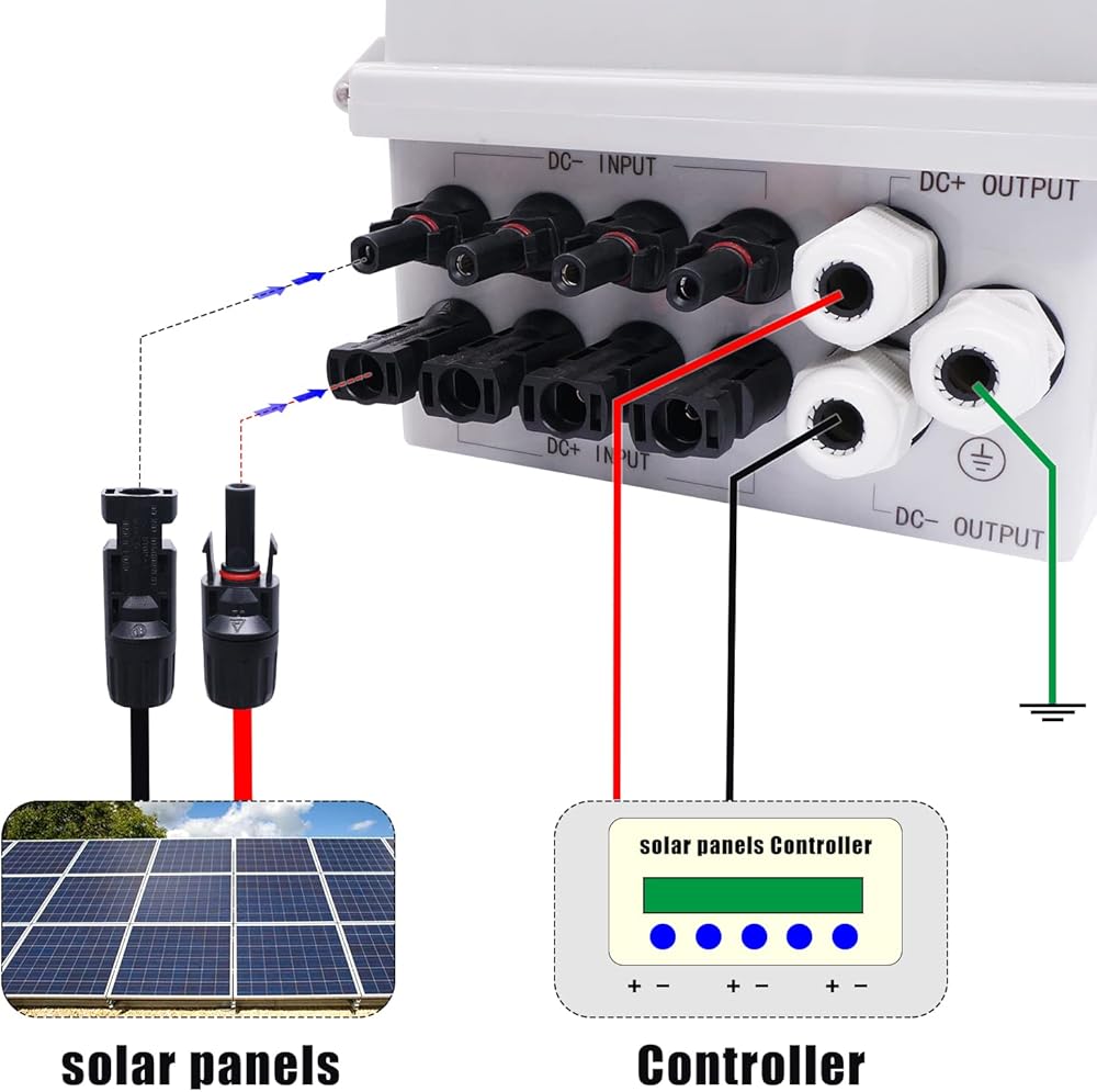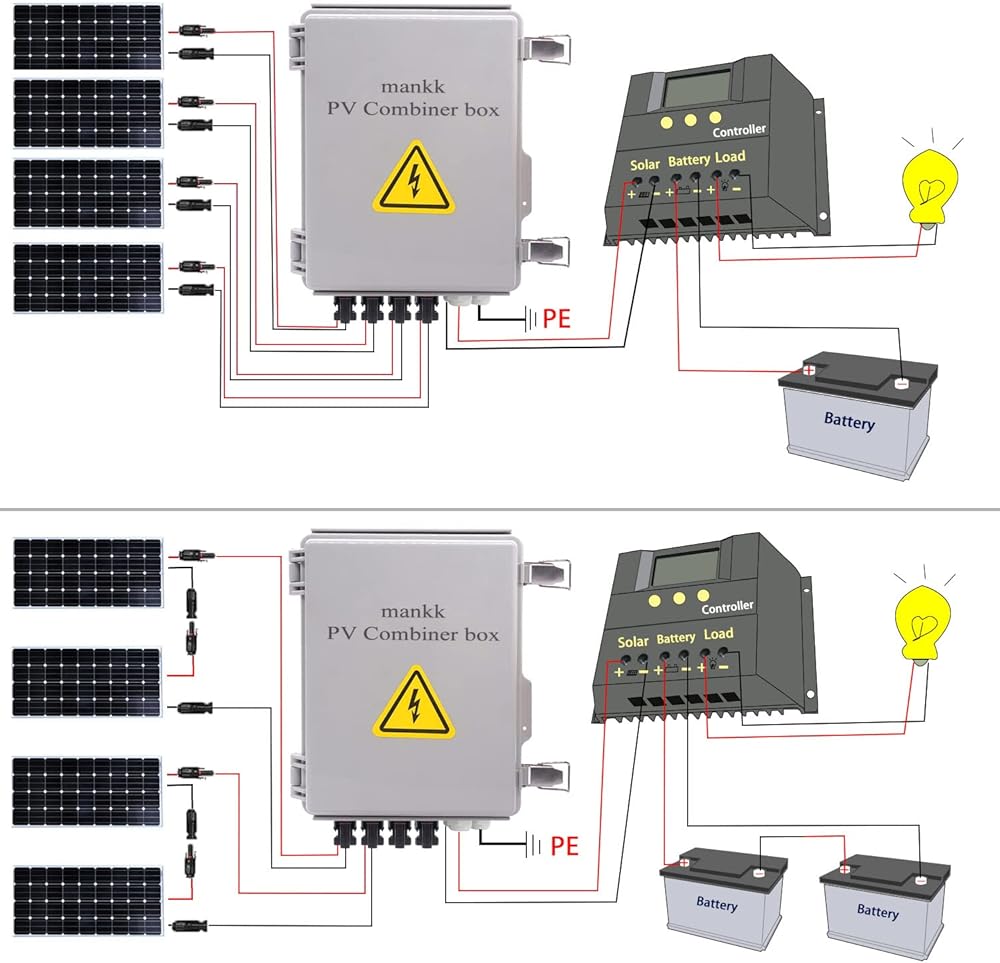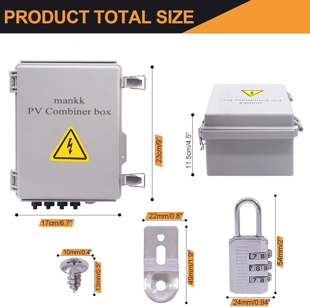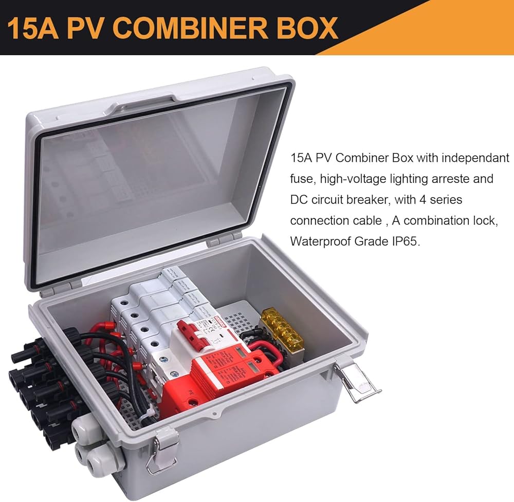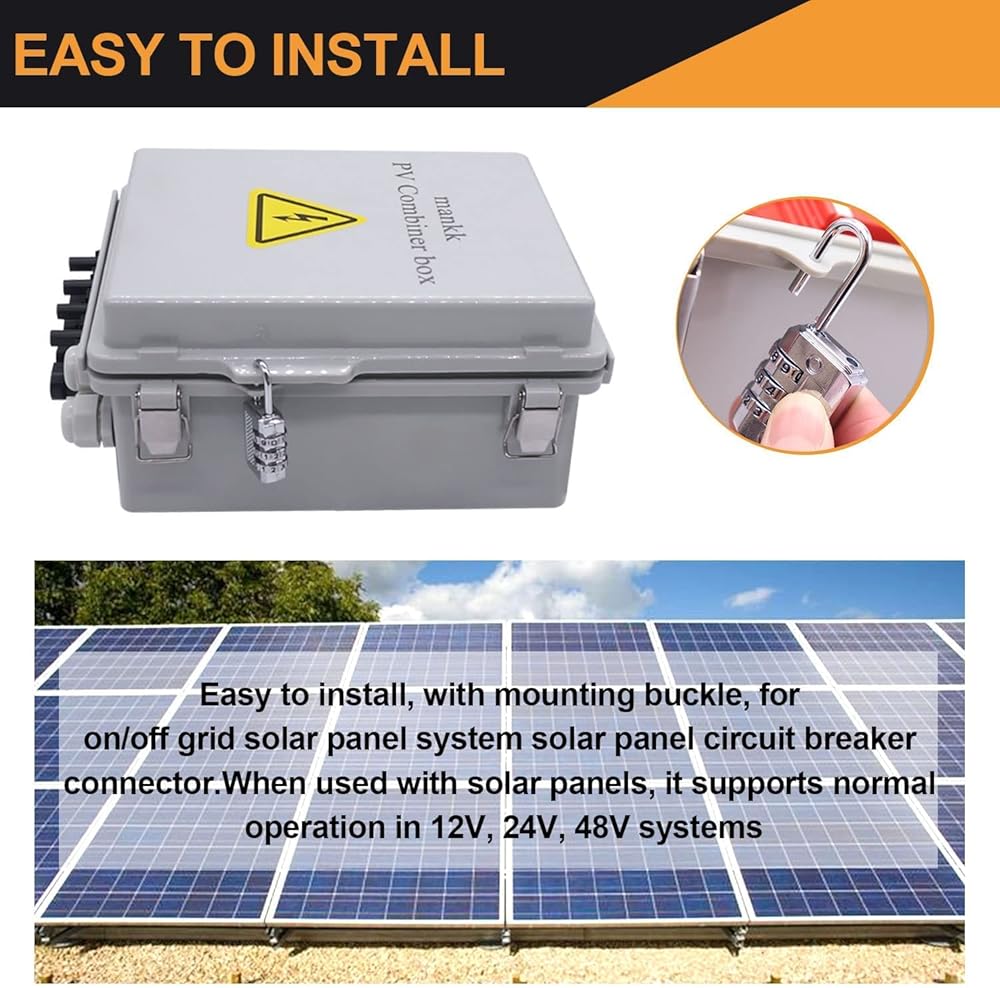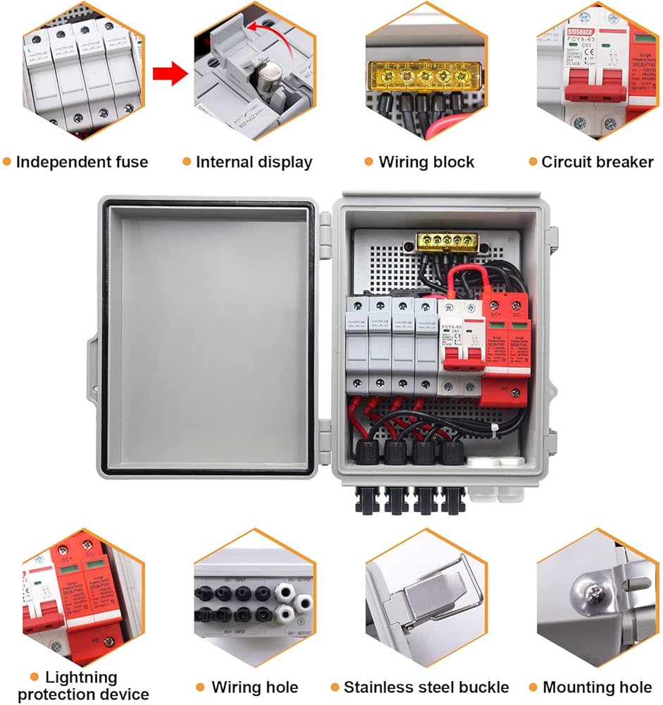 صندوق تجميع الطاقة الشمسية الكهروضوئية ذو 4 سلاسل من mankk، صندوق تجميع الطاقة الشمسية المقاوم للماء IP65 مع قاطع دائرة 63 أمبير، موصل طاقة شمسية مانع للصواعق وفتيل تيار مقدر 15 أمبير لنظام الألواح الشمسية على / خارج الشبكة PV-BOX-4X