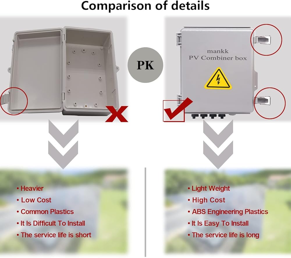 الأداء: صندوق الدمج عبارة عن غلاف قوي. مقاوم للمطر، ومقاوم للضغط، ومثبط للهب؛ توفر مانعات الجهد العالي الحماية من الصواعق. صمامات 15 أمبير، خصائص جيدة للحد من التيار، وقدرة عالية على الكسر. يحتوي 63A Breaker أيضًا على حماية من الجهد الزائد والتيار الزائد، والتي يمكن أن تقطع وتوصيل دائرة الحمل، وتوفر حماية من خطأ الدائرة القصيرة. الأسلاك البسيطة، مناسبة لأي سطح تقليدي، ويمكن أن تكون متوافقة بسهولة مع أي علامة تجارية للألواح الشمسية.
