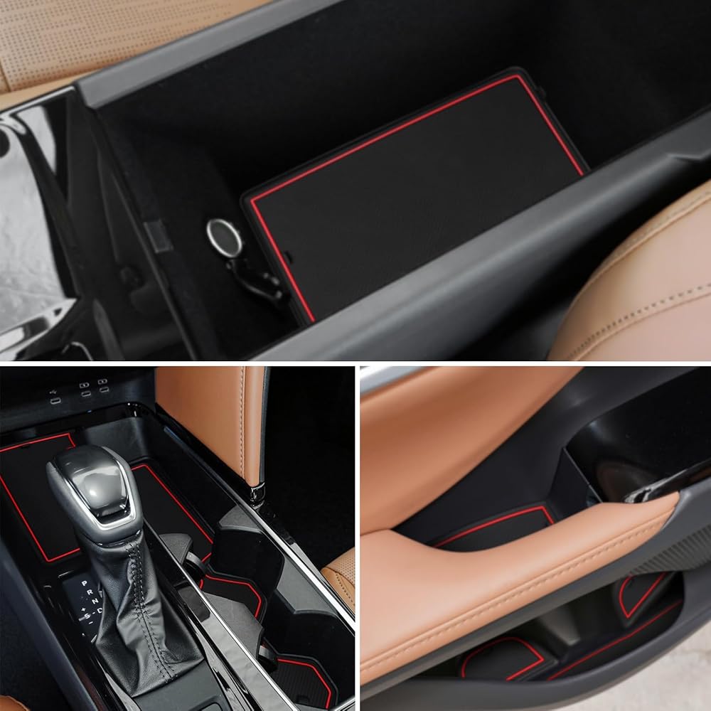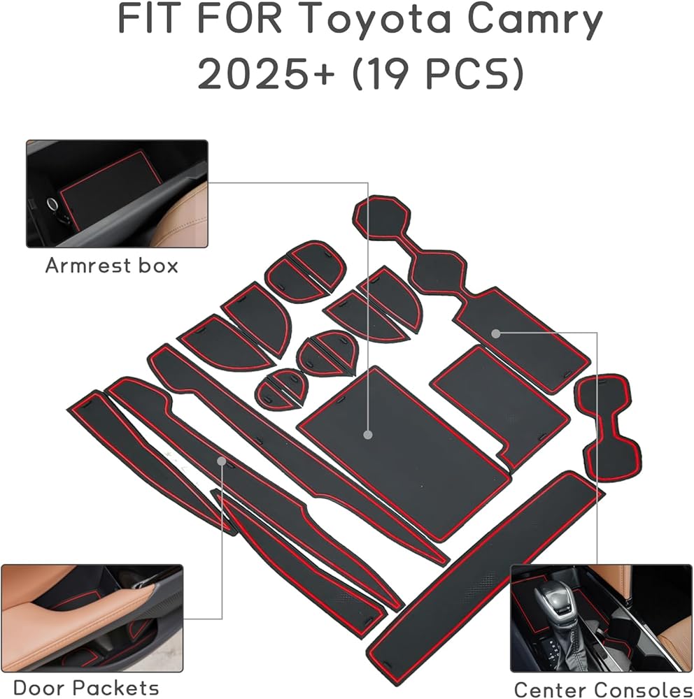 بطانات وحدة التحكم المركزية POSAID لسيارة Toyota Camry 2025 إدراج حامل الأكواب، سجادات وحدة التحكم المركزية لملحقات Camry مجموعة 19 قطعة من الحصير الداخلية المضادة للانزلاق والغبار، زخرفة حمراء