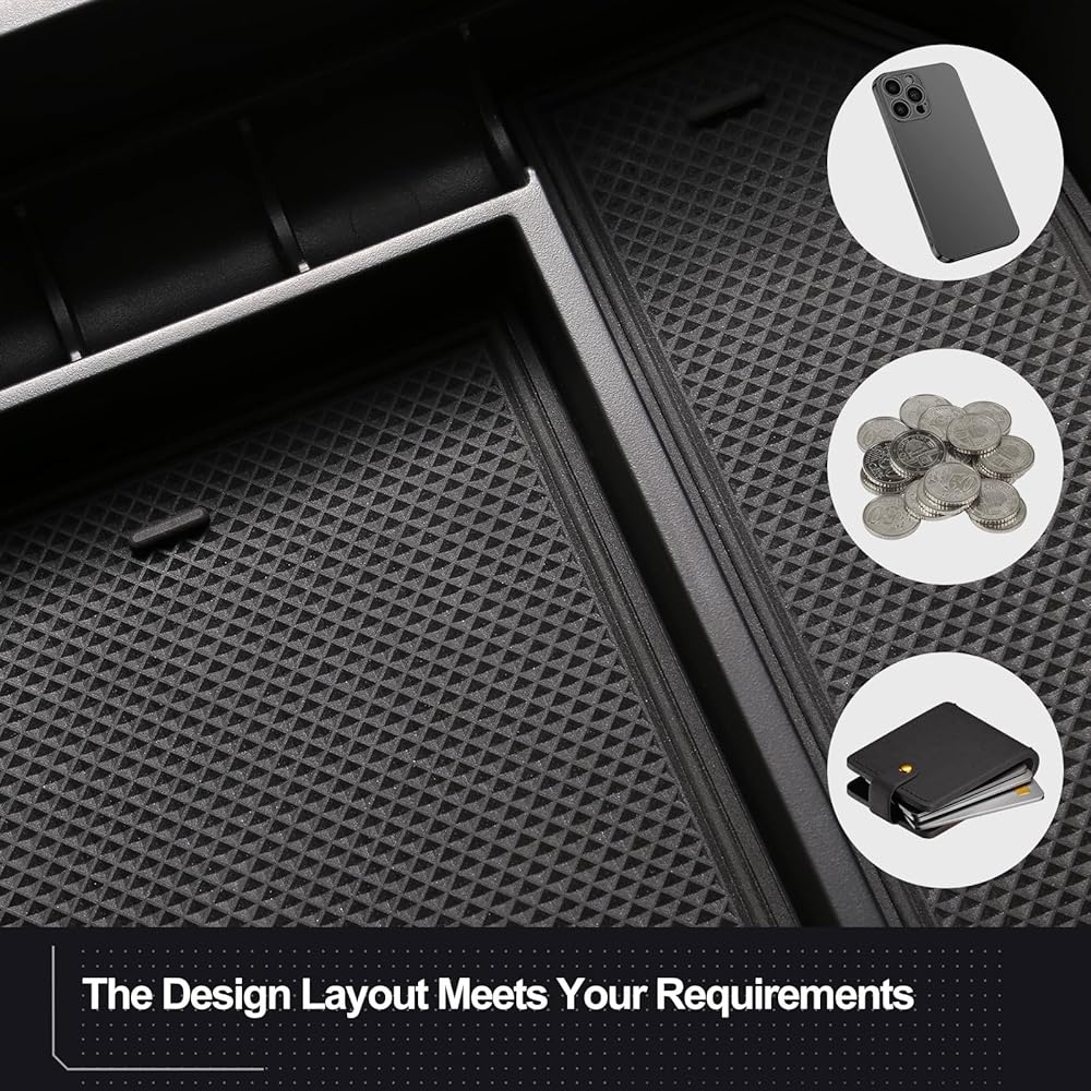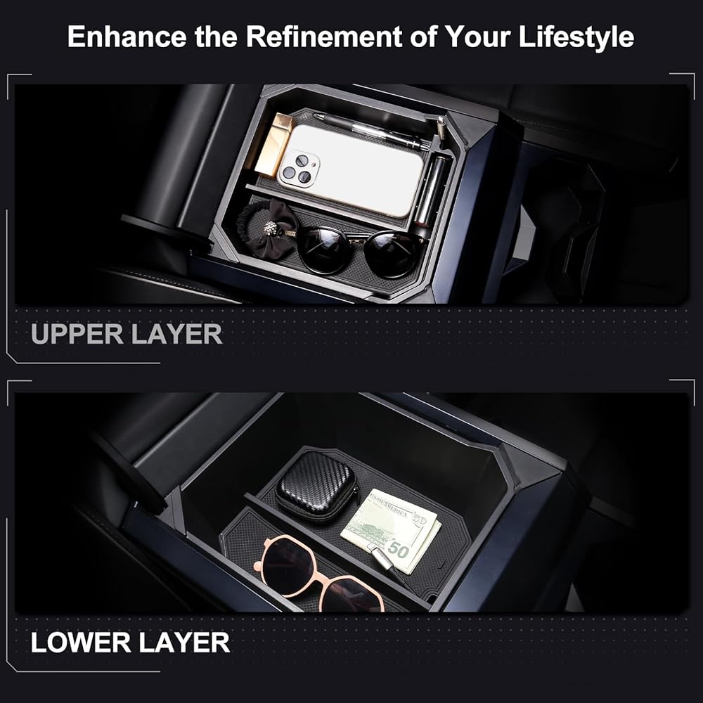 【الاستخدام الفعال】صمم منظم وحدة التحكم المركزية الخاص بنا لـ Tesla Cybertruck 2024 صندوق تخزين مركزي مزدوج الطبقات، يتميز بمقصورات تقسيم أكثر عقلانية لتلبية احتياجات التخزين اليومية الخاصة بك. من خلال الاستخدام الفعال للمساحة الداخلية، فإنه يضمن تنظيمًا مرتبًا للعناصر، مما يزيل الفوضى والفوضى.