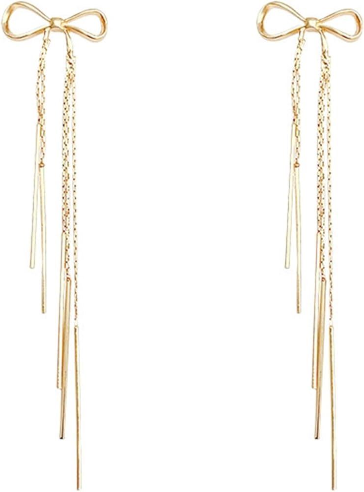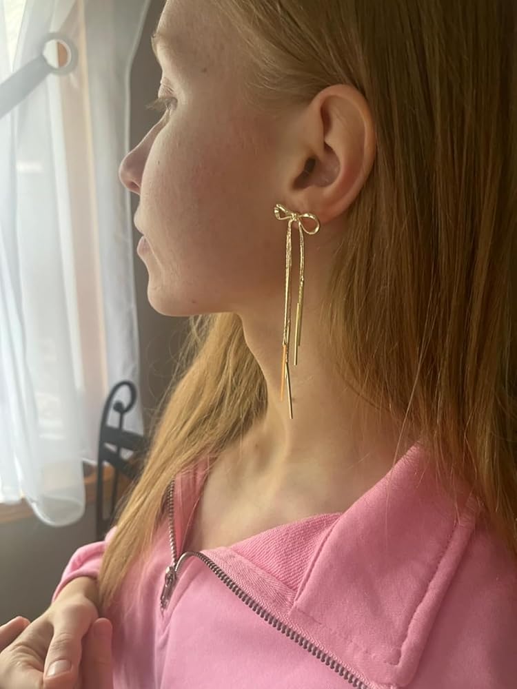 حلقات القوس: ما ستحصل عليه هو زوج من الأقراط المتدلية ذات القوس تتميز بتصميم على شكل قوس شريطي مع سلسلة فضية أو سلسلة ذهبية. أقراط متدلية بشريط على شكل فيونكة مربوطة يدويًا، شكل فريد من نوعه مع سلسلة أنيقة مع ذيلين رشيقين رقيقين وأنيقين وعصريين!