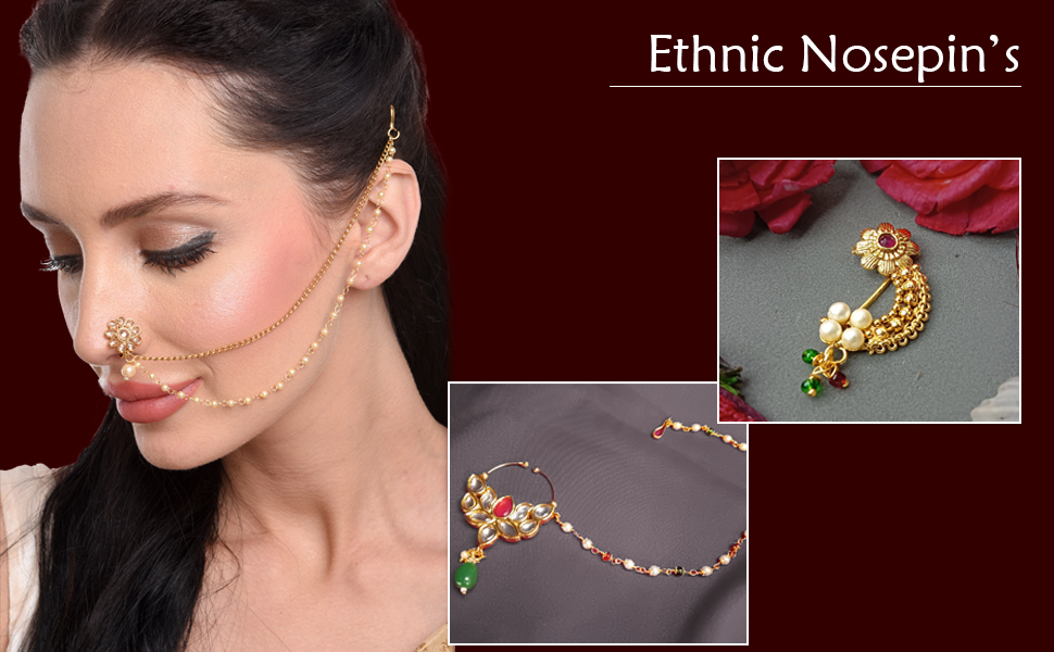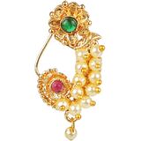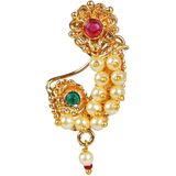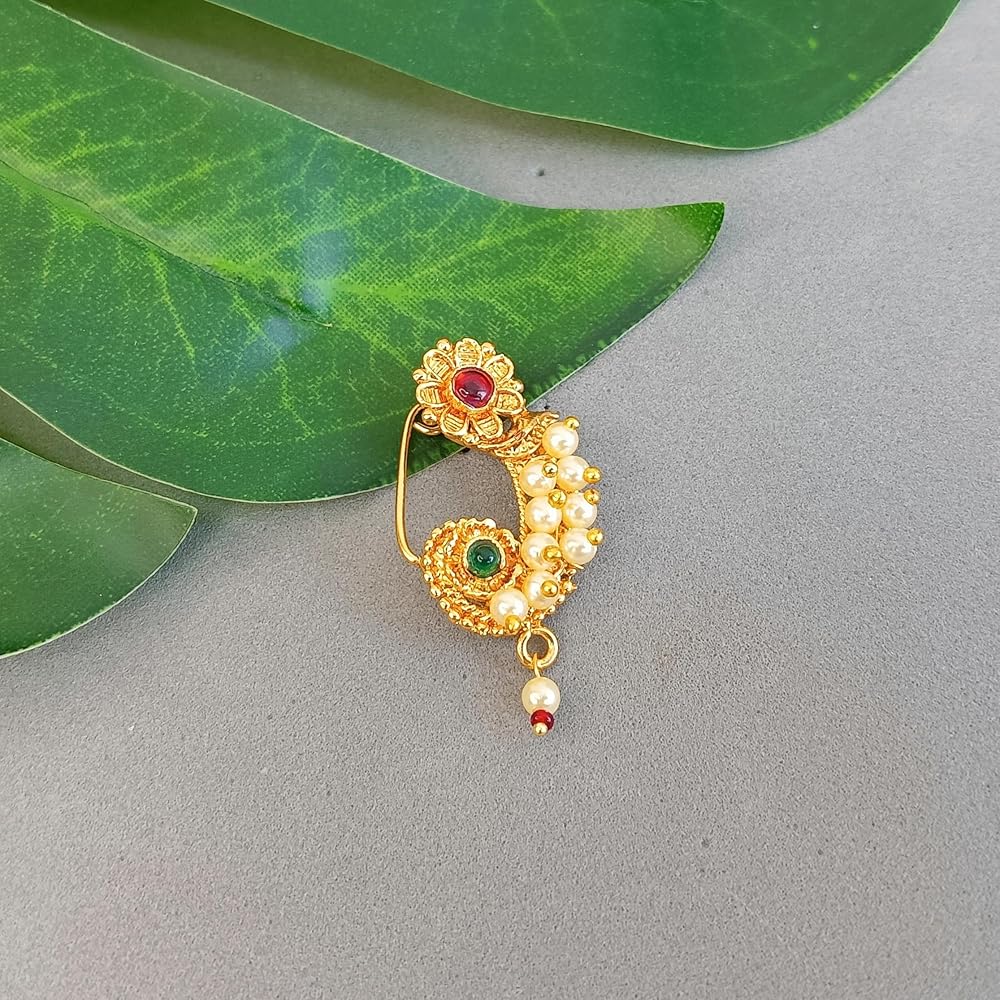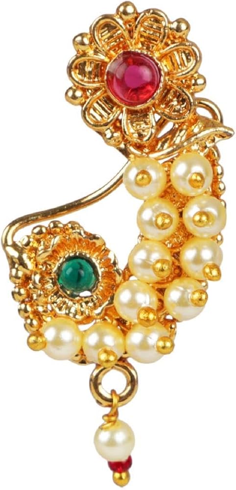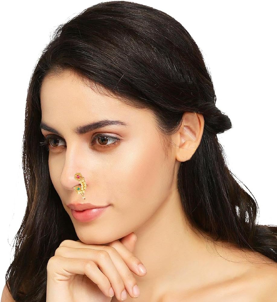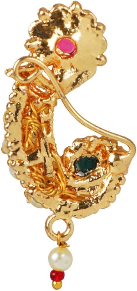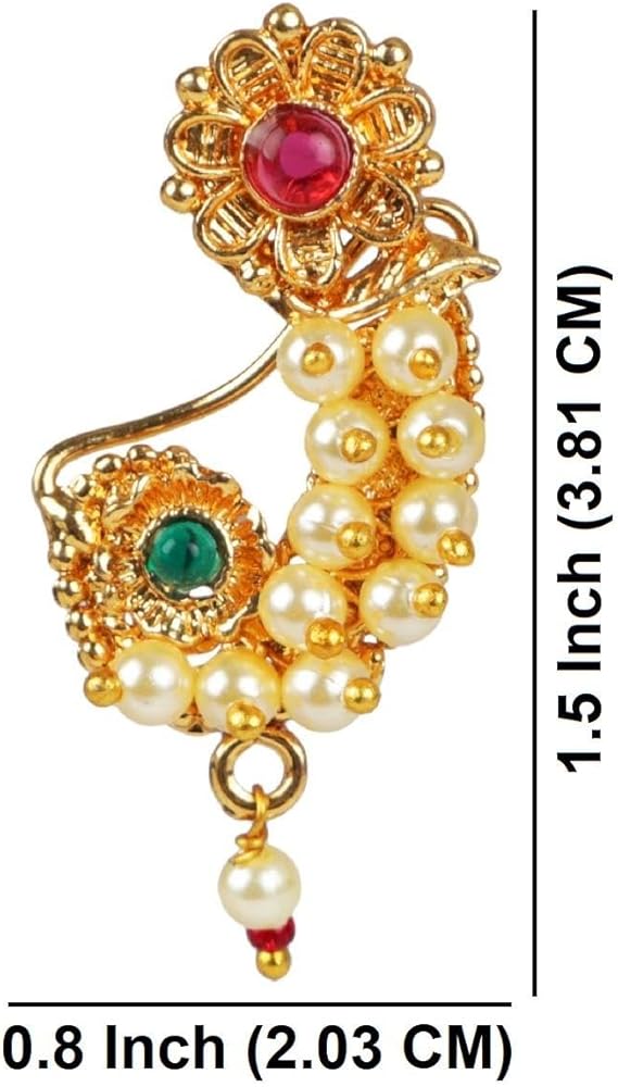 This exquisite and elegant Indian bridal jewelry Maharashtrian style nath nathni clip on kundan crystal gold tone fake nose ring hoop nose pin stud nose ring fake nose septum statement jewelry costume accessories for women adds a contemporary cum trendy touch to your ensembles. This women's party wedding jewelry fake non piercing nose stud pin is embellished with kundan stone and faux peal drop, a classic fusion of exquisite craftsmanship and feminine elegance. This includes an insight of crude ethnic excellence for all type of traditional, trendy cum contemporary look. Perfect bridal nose jewelry accessories, wear this with your gorgeous traditional dress or wedding gown on any wedding, party, engagement, ring ceremony, anniversary or any festive or special occasion. Perfect Gift For Any Occasion! Ideal Valentine, Thanks giving, Mother's Day, Christmas, Anniversary gift. CARE INSTRUCTIONS: Avoid contact with heat, chemicals and water. Clean with dry cotton cloth. Pack in an air tight container/ pouch after use. It is advisable to wear the jewellery after makeup.