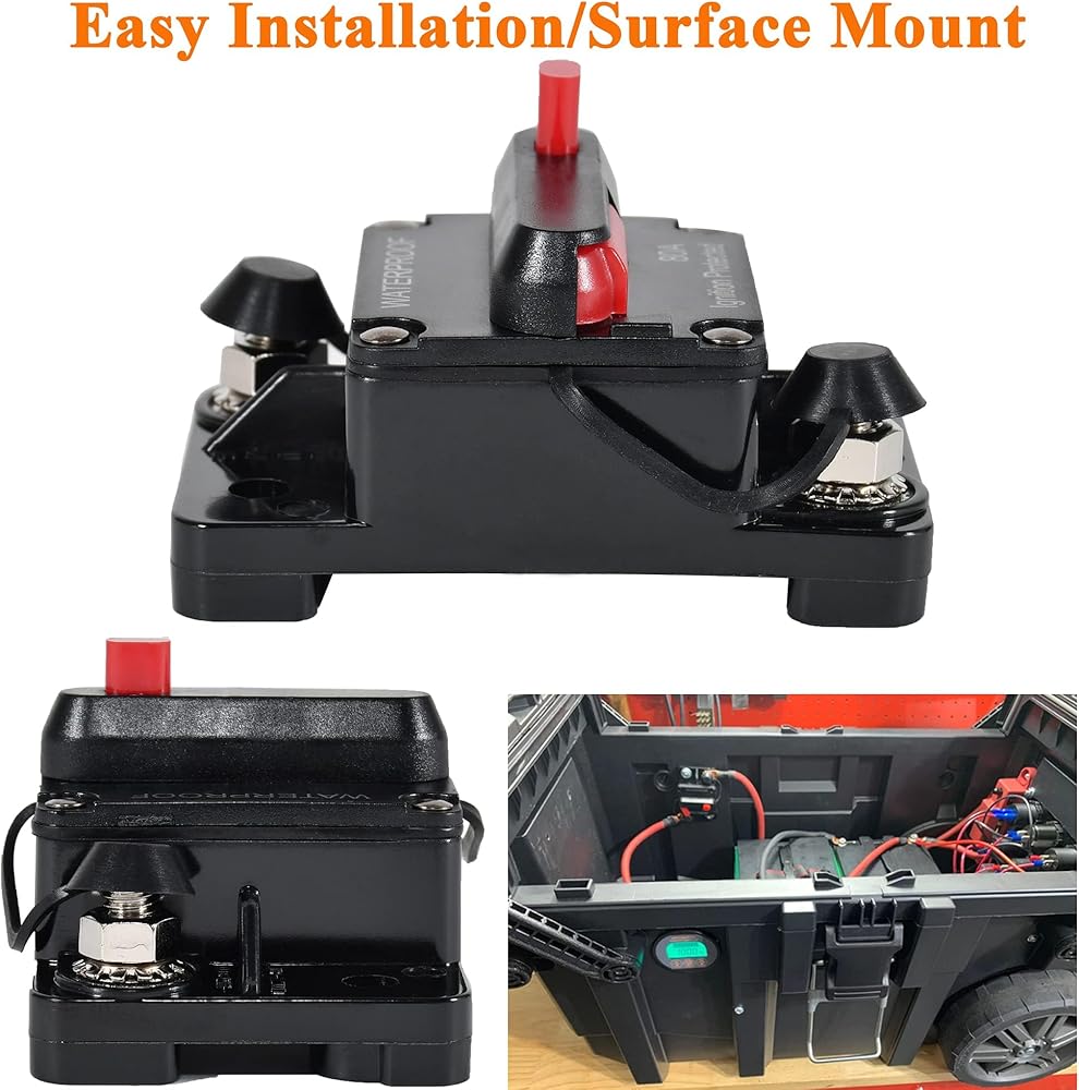 زر إعادة الضبط اليدوي: يأتي قاطع الدائرة الكهربائية عالي التيار مع زر إعادة الضبط اليدوي، ويمكن استخدامه كمفتاح تشغيل/إيقاف للبطارية؛ قاطع الدائرة الصوتية للسيارة بدلاً من حامل المصهر المضمن، ليست هناك حاجة إلى إنفاق الأموال لاستبدال المصهر المضمن