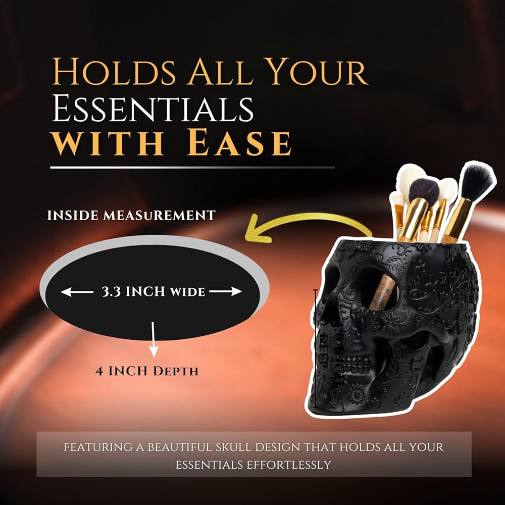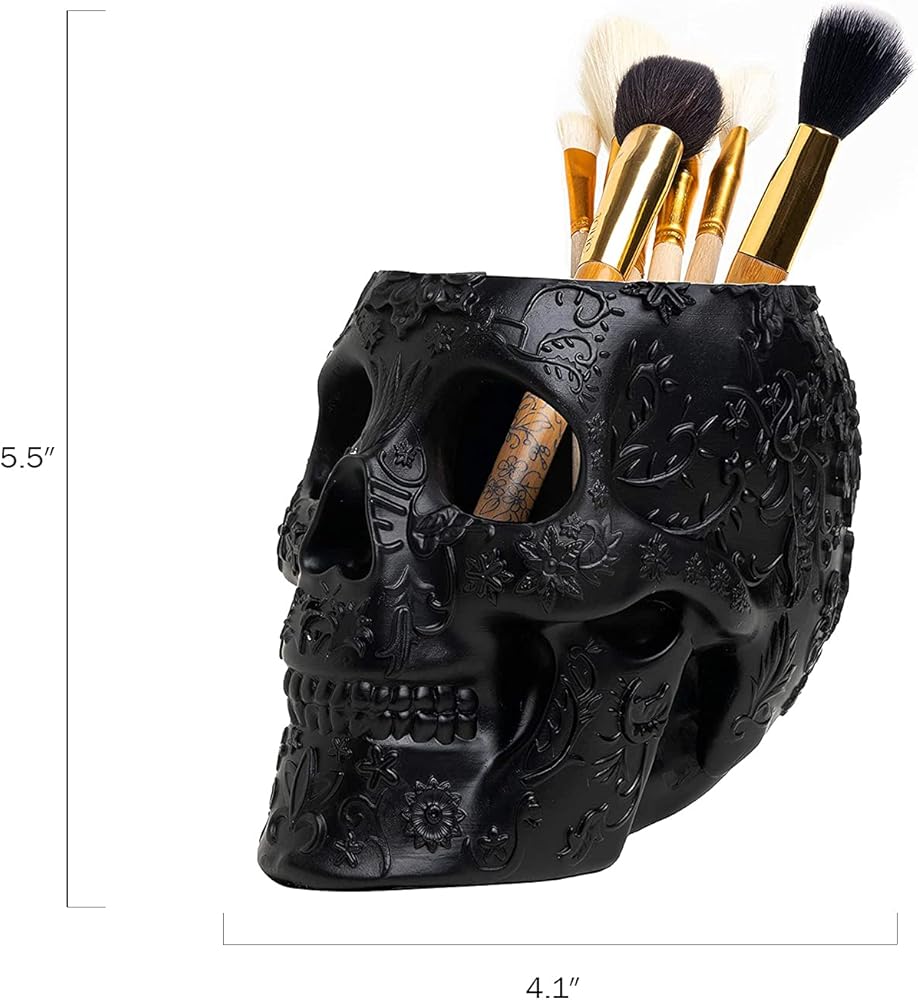 قوي ومفيد: حامل فرشاة مكياج على شكل جمجمة، حامل جمجمة قوي من الراتنج للأقلام أو فرش المكياج، حامل Skul للأقلام والفرش والإكسسوارات الأخرى. الحجم 4.1 × 5.5 بوصة - 10.5 سم × 14 سم