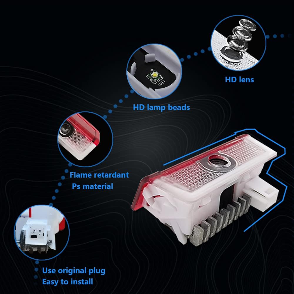 سهلة التركيب: التوصيل والتشغيل! لا توجد حفر أو تعديل، فقط استبدل الضوء القديم مباشرةً، ويمكن إكماله بسهولة في 5 دقائق. شعار ضوء الباب يجعل سيارتك أكثر جاذبية.