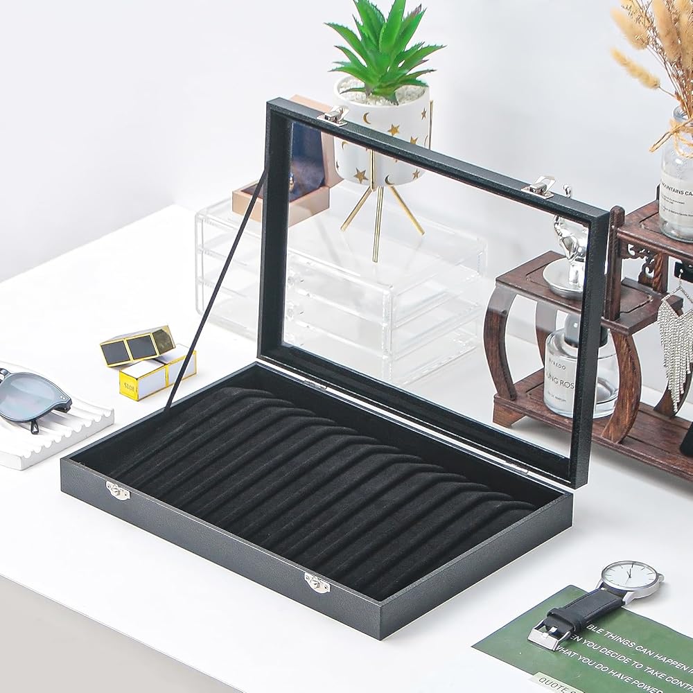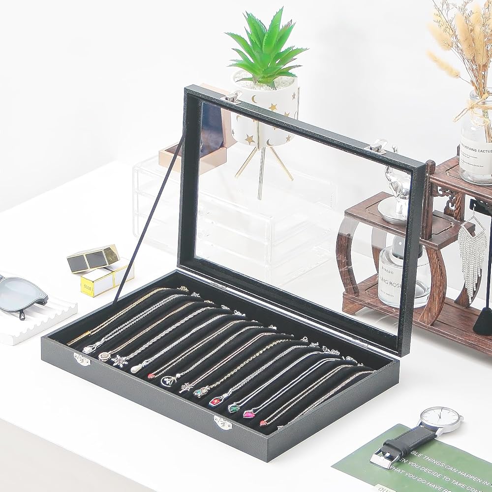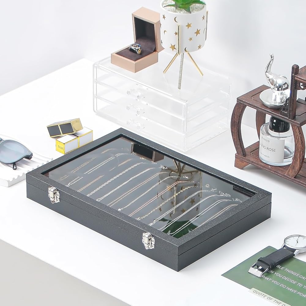 • Design Idea: 14 Hooks Necklace Display Organizer has 14 hooks to effectively separate your necklaces and prevent your precious necklaces from getting tangled together. With the clear glass lid design, you can quickly find the necklace you are looking for. Two safety locks prevent the lid from being easily opened.