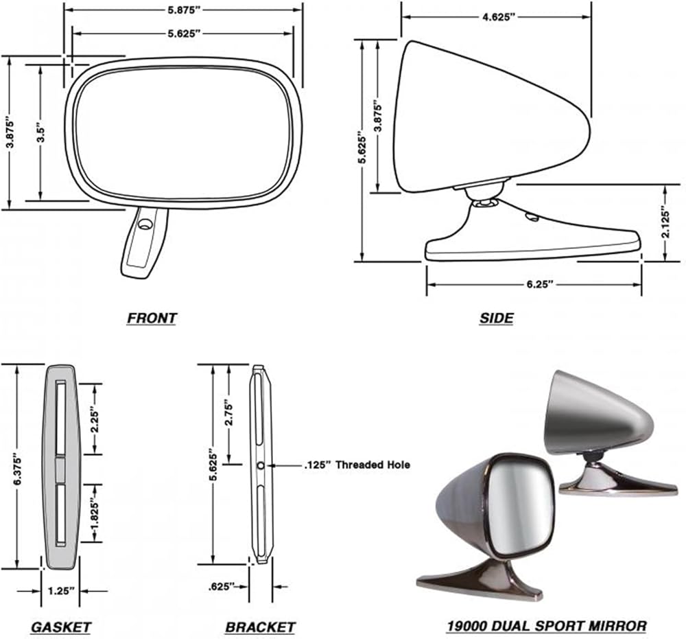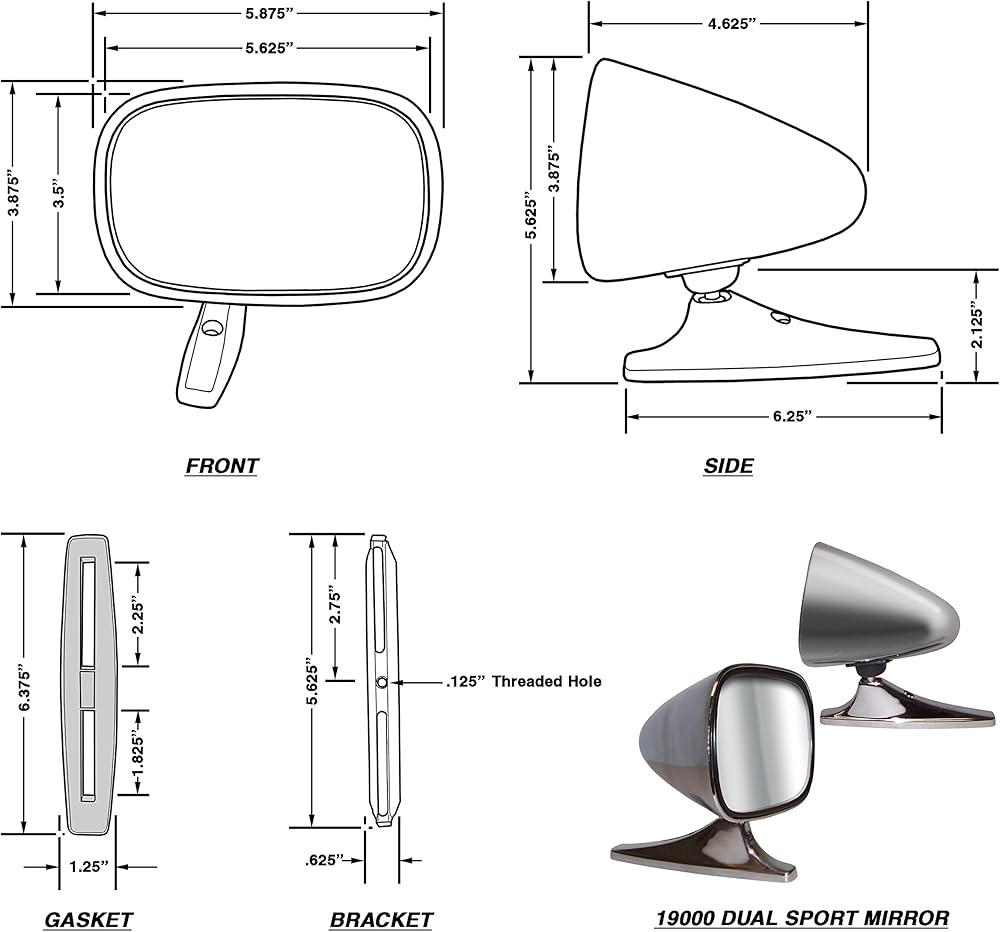 CIPA Dual Sport Mirrors were designed to be a universal replacement for most small original equipment mirrors on most cars. The mirror head is made of chrome plated plastic and will never rust of corrode. The Dual Sport Mirrors feature a 5.875 x 3.75 inch oblong aerodynamic mirror head with a 5.375 x 3.313 inch glass surface. The mirror head is fully adjustable utilizing a ball and socket attachment system. The large glass surface combined with the pivoting head provides the ultimate in rearward vision. The Dual Sport Mirror was designed to mount using existing holes so drilling may not be necessary with some applications. The total length of the chrome plated aluminum base on the mirror is 6.125 inches. The kit features a universal space bar bracket to ensure a perfect fit every time. The universal space bar is 5.5 inches in length and has 2 slots. The two slots on each end measure in at 2 inches in length. The space bar also has a threaded mounting hole between the two slots to bolt the space bar to the base of the mirror. It also comes with a mounting gasket to protect your paint job from being scratched, gouged, or marred during installation. Each Kit includes 2 mirrors (driver and passenger side), 4 self-tapping screws, 2 bolts, 2 mounting brackets, 2 gaskets, and 1 set of instructions. The included gaskets may also be used as a template to drill holes for new installations. The self-tapping screws provided will accommodate both replacement installations as well as new installations.