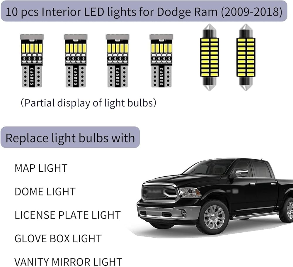 المركبات المتوافقة: تم تصميم هذه المجموعة الكاملة من مصابيح LED الداخلية خصيصًا لتناسب 2009-2018 Dodge Ram 1500 و2500 و3500 (قد لا تناسب 2014 Ram 1500 Laramie & Limited).