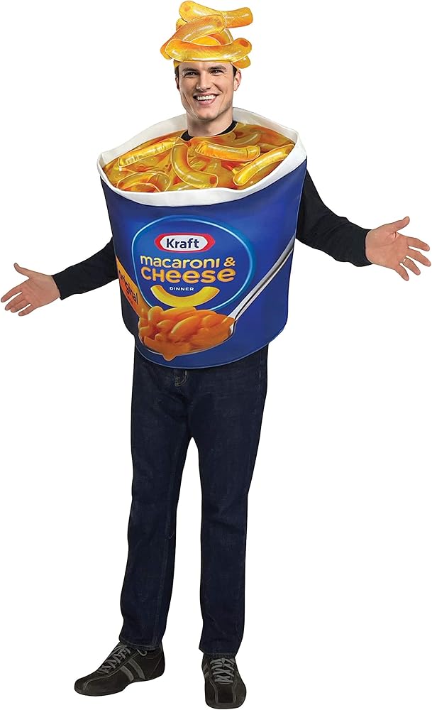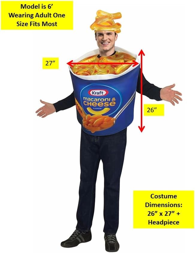 • CHEESE THE DAY: Cheese the day and get ready to look like you're drowning into a mighty pool of cheese and cream with Kraft Mac and Cheese Dinner Cup Costume.