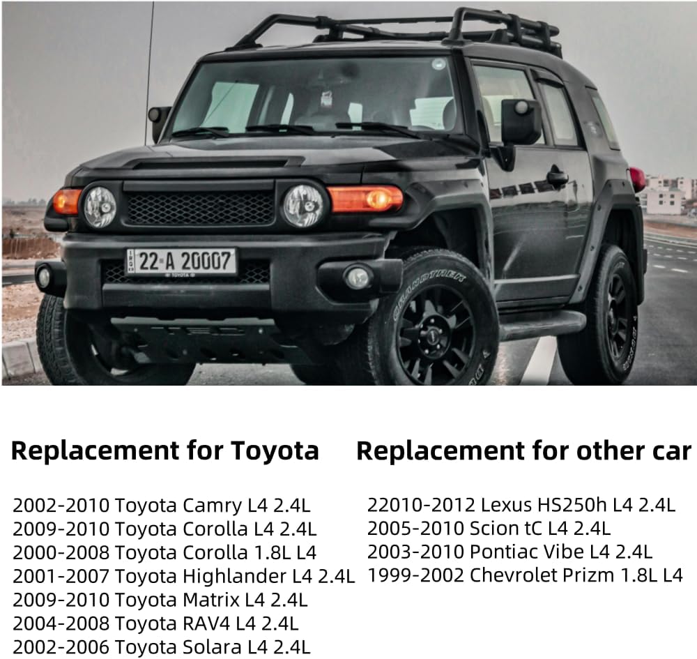 • Compatible with: Compatible with Highlander 2001-2007 L4 2.4l,Fits for Matrix 2009-2010 L4 2.4l/2003 - 2008 1.8l L4,Fits for Mr2 Spyder 2000 - 2005 1.8l L4,Fits for Rav4 2001-2003 L4 2.0l,Fits for Rav4 2004-2008 L4 2.4l,Fits for Pontiac Vibe 2009-2010 L4 2.4l,Fits for Pontiac Vibe 2003 - 2008 1.8l L4,Scion Tc 2005-2010 L4 2.4l,Solara 2004-2006 L4 2.4l,Fits for Solara 2002-2003 L4 2.4l
