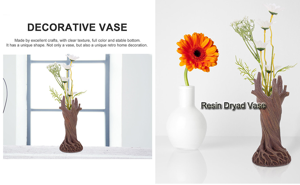 • تصميم فريد: هذه المزهرية الرائعة على شكل جذع الشجرة، المحفورة من أجود أنواع الراتنج، هي تحفة حقيقية. إن تصميم درياد المحفور عليه هو عمل فني، مفصل بشكل رائع بحيث يبدو أن روح الغابة نفسها قد تنبثق من الداخل. الأناقة الطبيعية التي تضفيها على أي مساحة تشبه النسيم اللطيف الذي يتدفق عبر الأشجار، مما يملأ الغرفة بشعور من الهدوء والدهشة