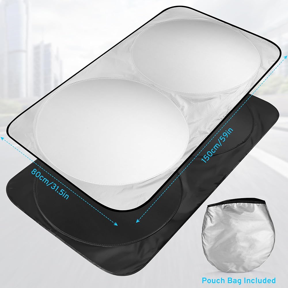 【سهولة التخزين】: تم تصميم المظلة الشمسية للزجاج الأمامي للسيارة بحلقة فولاذية يمكن لفها وطيها بحرية، وعندما تريد تخزينها، ما عليك سوى طيها ولفها على طول الحلقة الفولاذية لتشكيل "8" الشكل (يرجى الرجوع إلى فيديو التخزين الخاص بنا على رابط المنتج)، ضعه في حقيبة التخزين التي تأتي مع المنتج، ويمكن تخزينه في أي مكان في السيارة لتوفير المساحة.