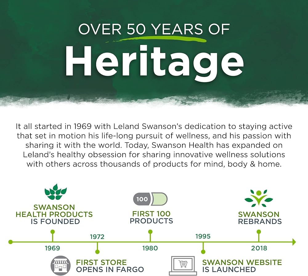 OUR QUALITY COMMITMENT: For nearly 50 years, Swanson has delivered science-backed health products worldwide. Each wellness supplement is made in our GMP certified facilities, and our purity and potency testing includes independent third-party labs.
