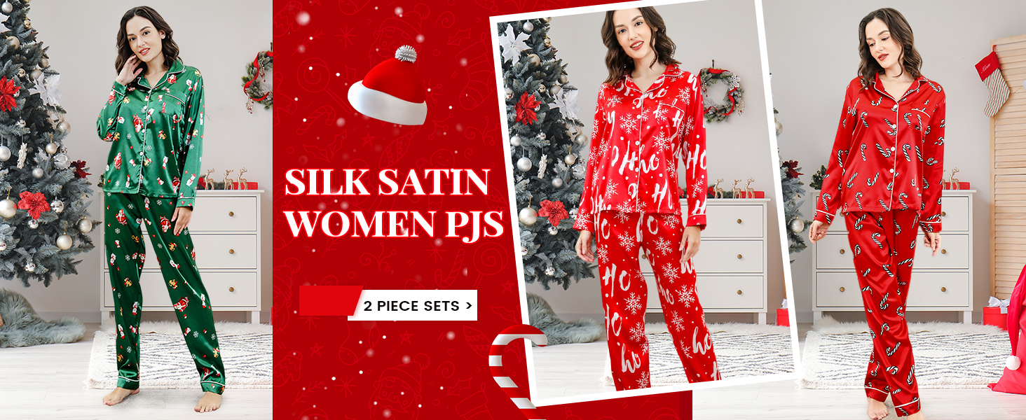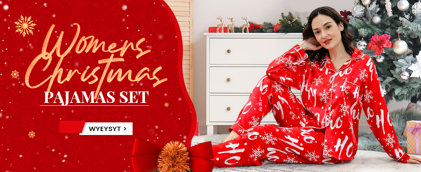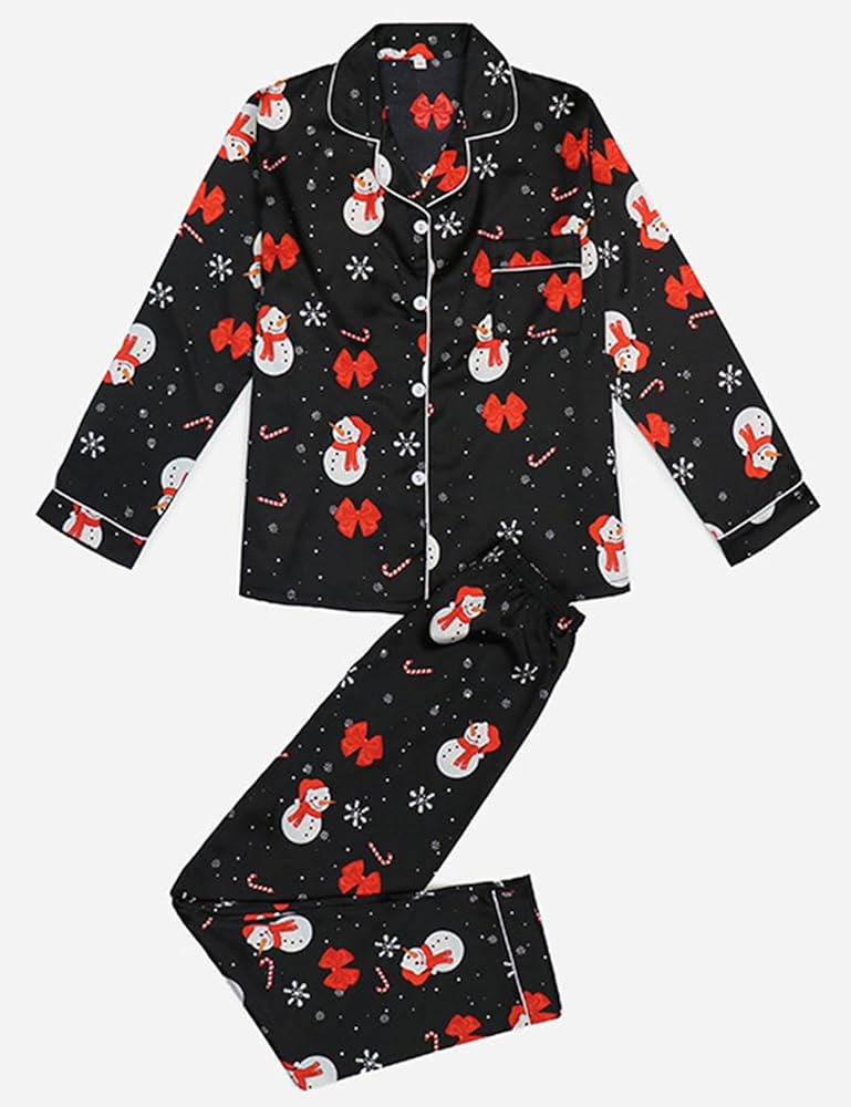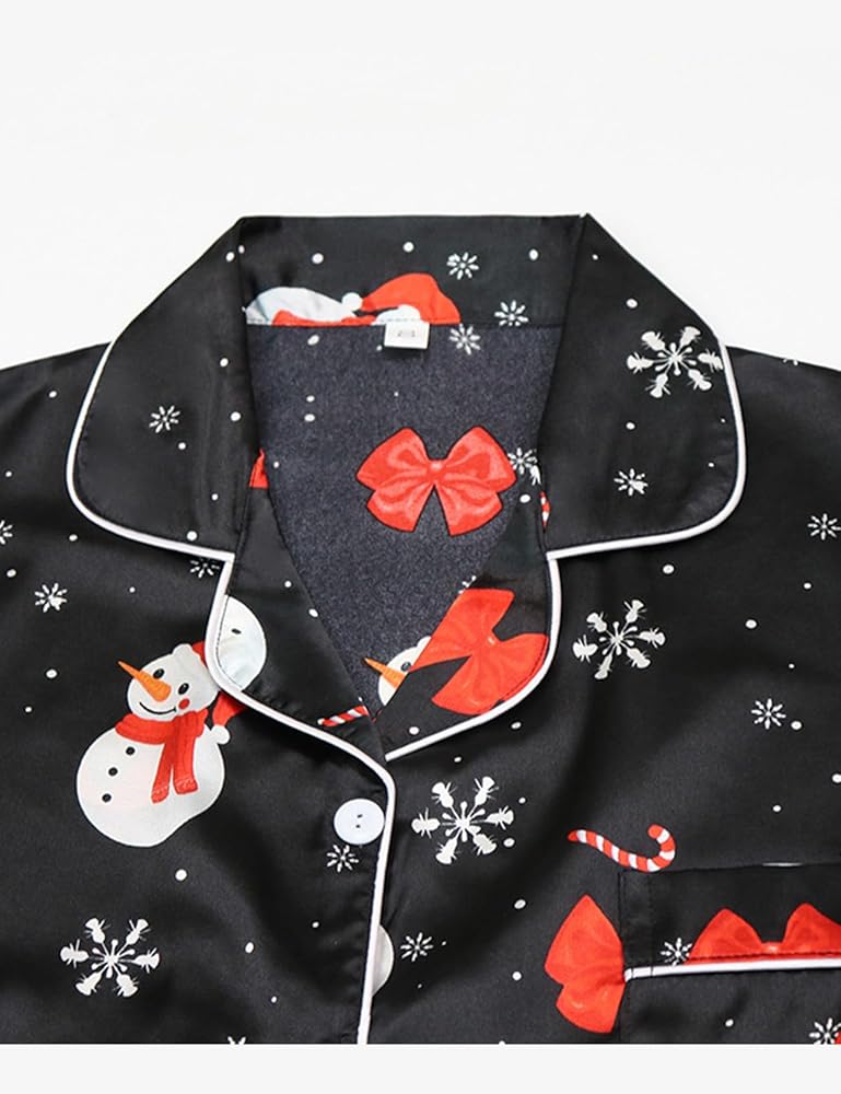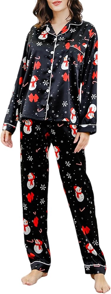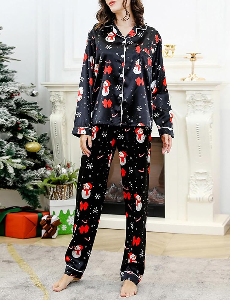 طقم بيجامات عيد الميلاد للسيدات من Wyeysyt طقم ملابس نوم من الساتان الحريري بأكمام طويلة طقم Pjs ناعم مكون من قطعتين بأزرار لأعلى مجموعات صالة عيد الميلاد المضحكة (أسود-L)