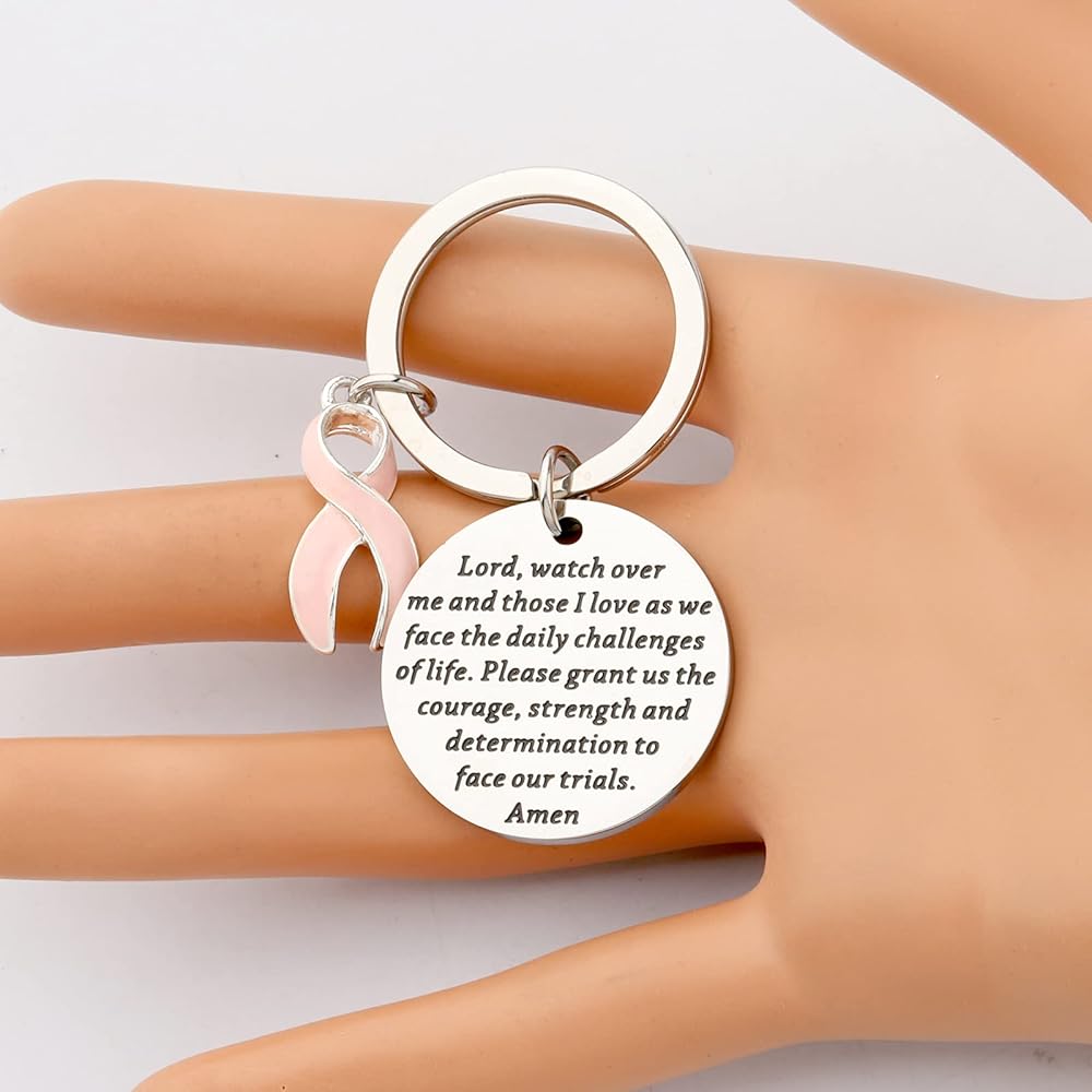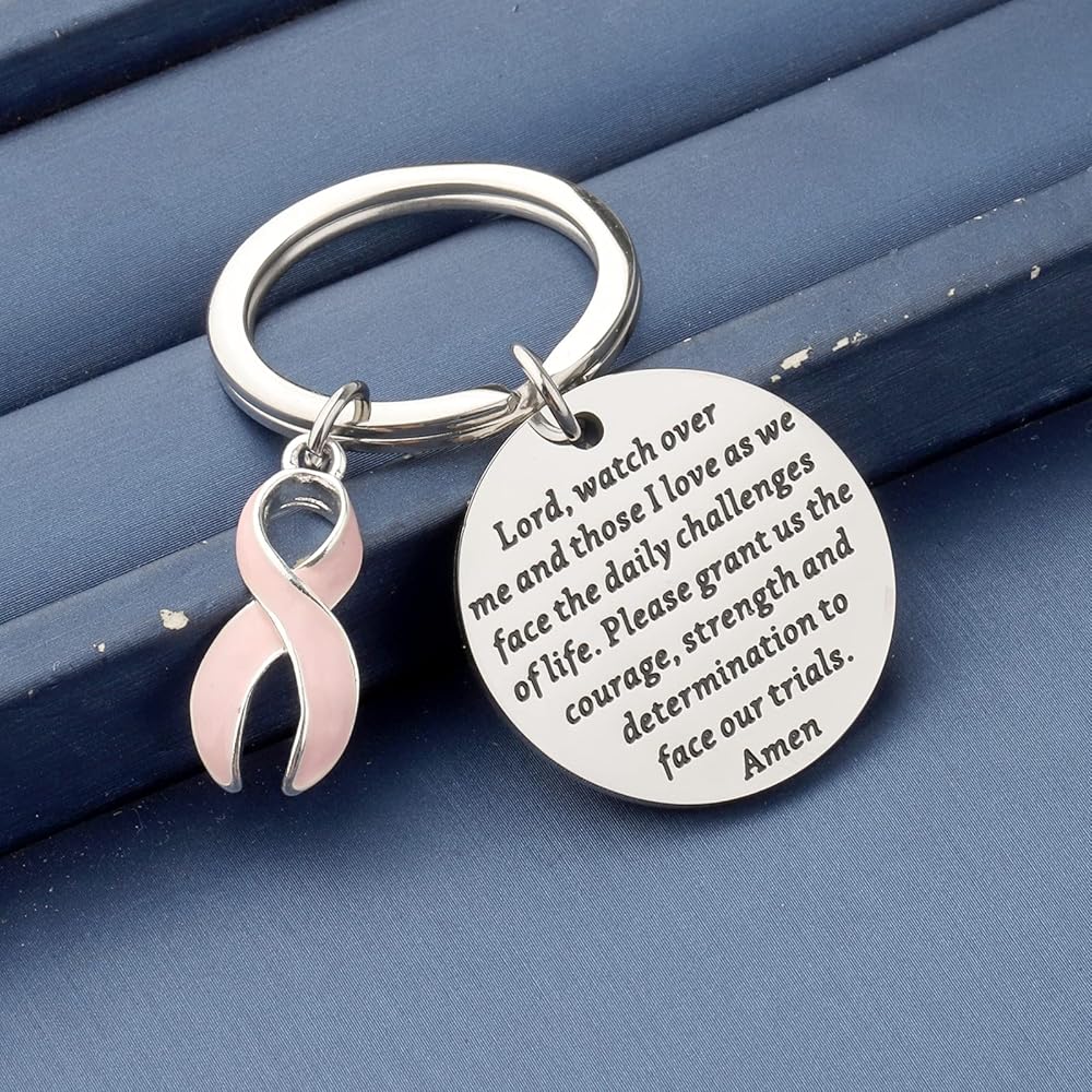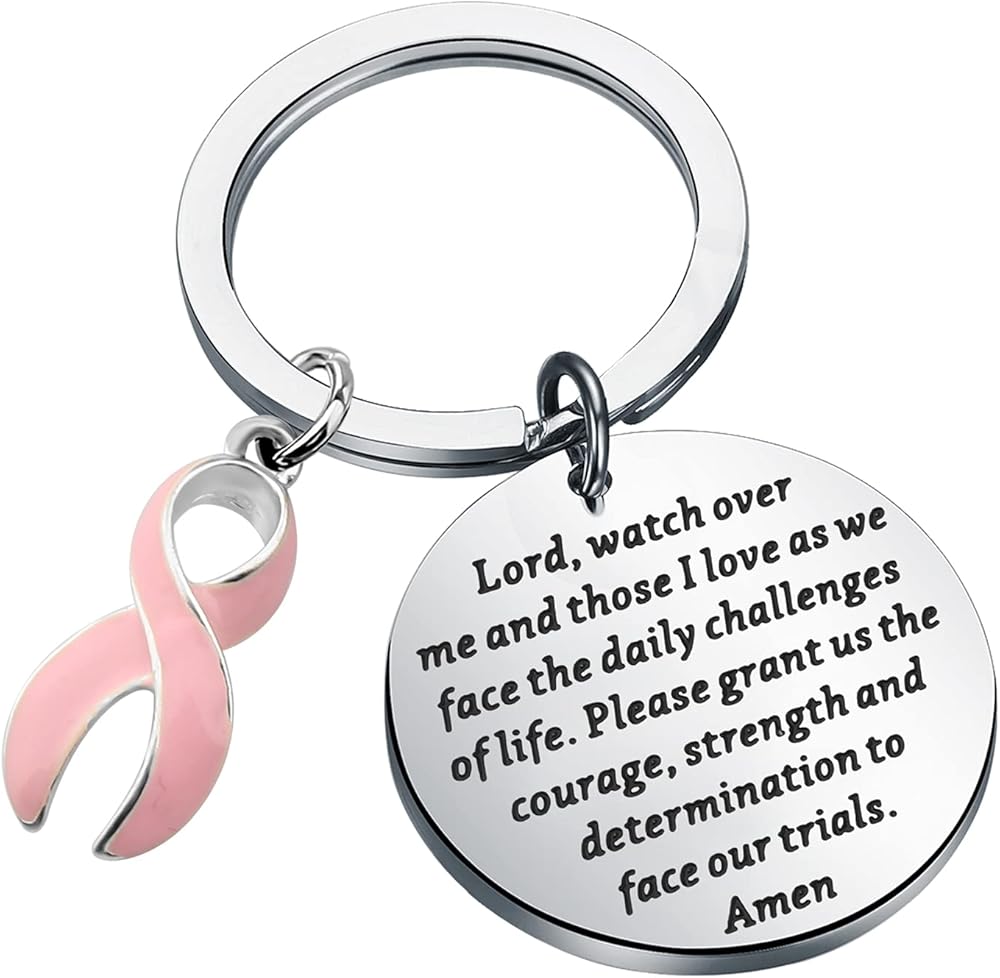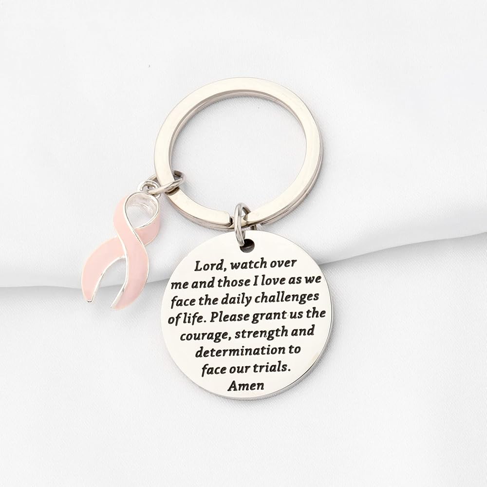 The Pink Ribbon keychain engraved with:Lord, watch over me and those I love as we face the daily challenges of life. Please grant us the courage, strength and determination to face our trials. Amen. Appropriate for a cancer patient, someone with a terminal illness or just inspiration to get through life knowing God is in control!