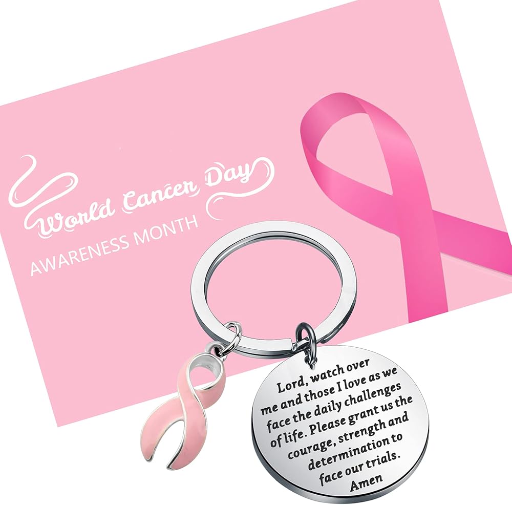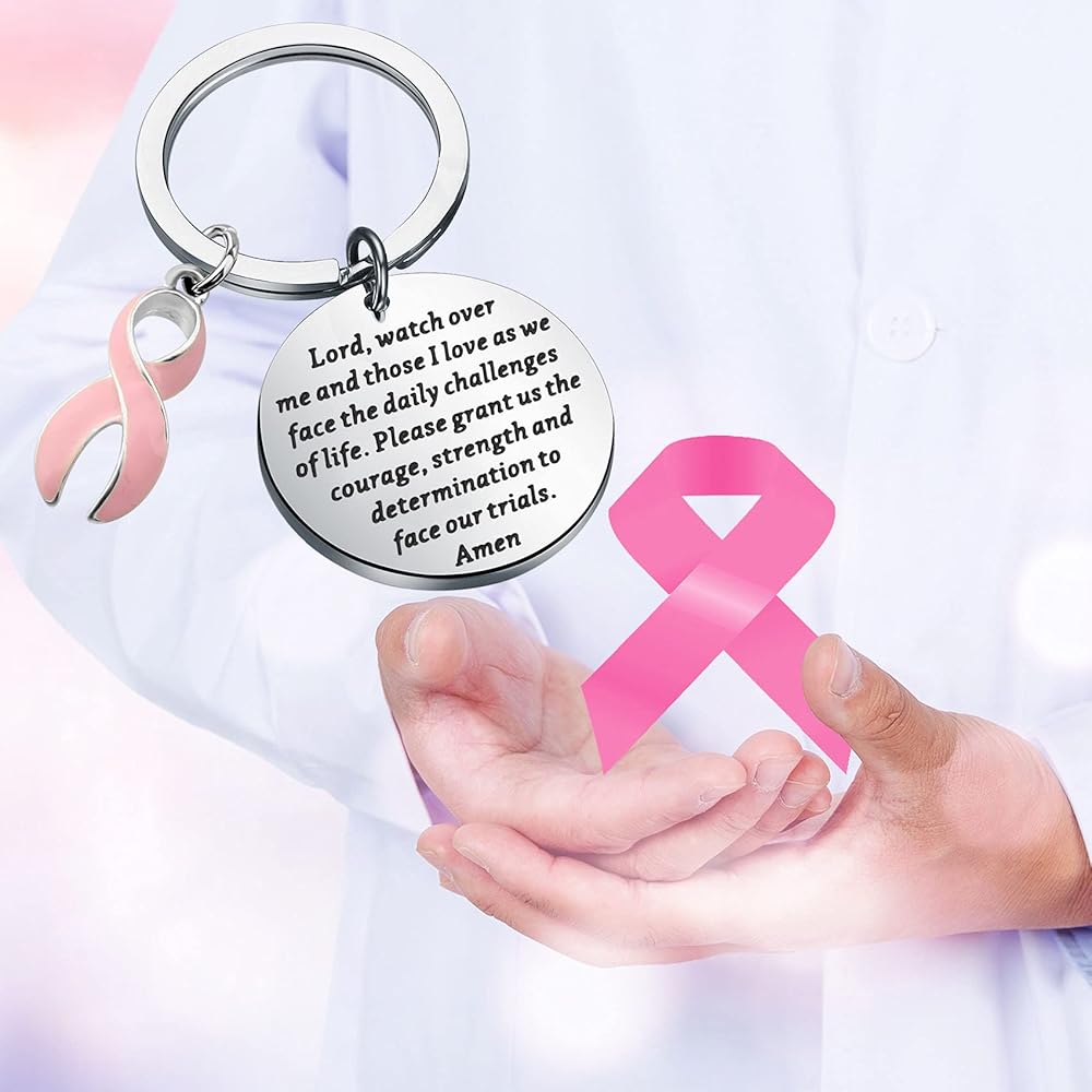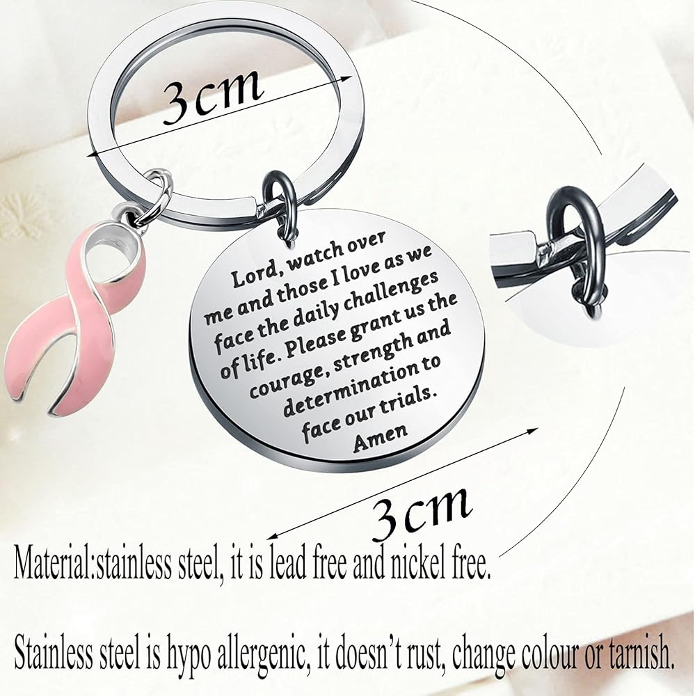 The Pink Ribbon keychain engraved with:Lord, watch over me and those I love as we face the daily challenges of life. Please grant us the courage, strength and determination to face our trials. Amen. Appropriate for a cancer patient, someone with a terminal illness or just inspiration to get through life knowing God is in control!