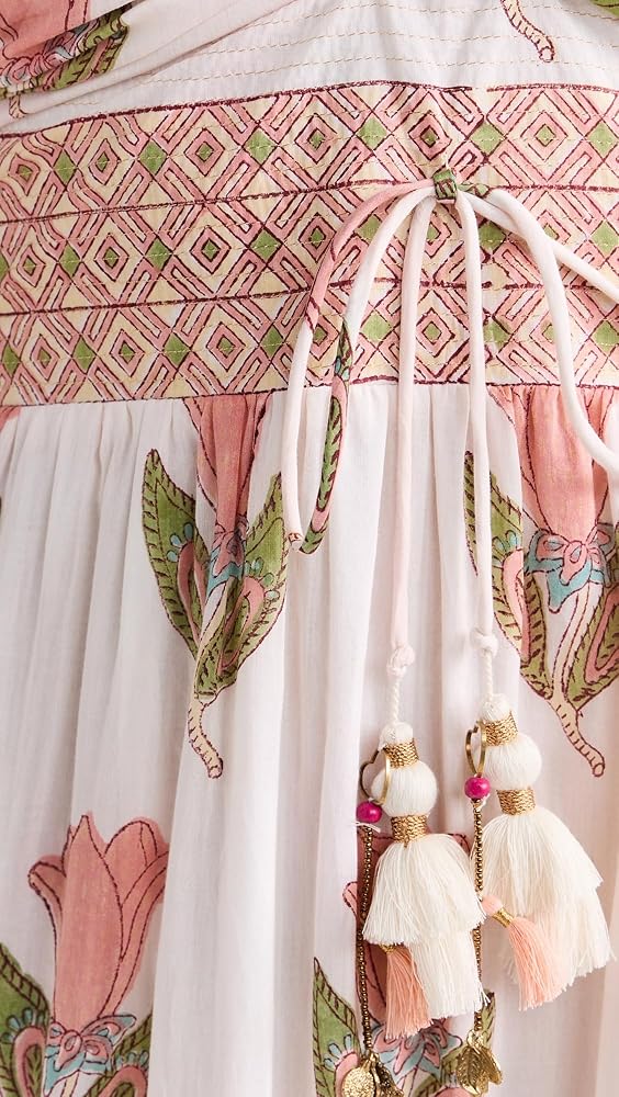ربطة عنق مزخرفة مع شرابات مطرزة في الأمام، لوحة خلفية مرنة مدخنة، طباعة زهور وخيوط معدنية، تنورة ذات طبقات