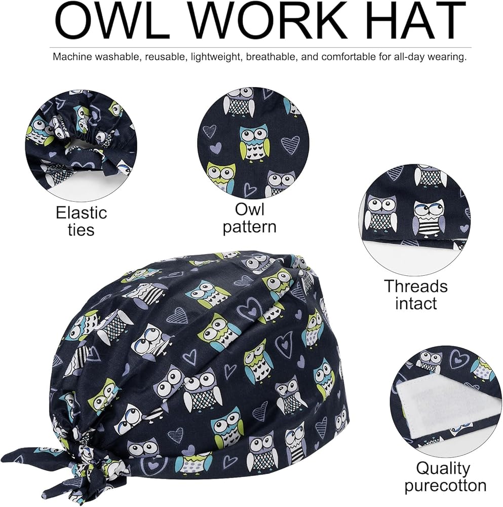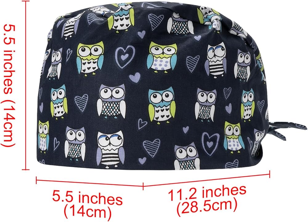 Package includes: 1 x cartoon owl bouffant scrub caps women with ties.