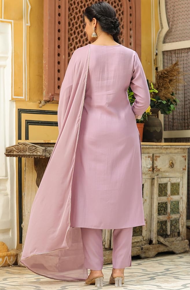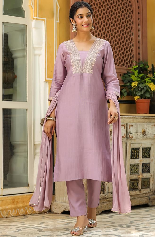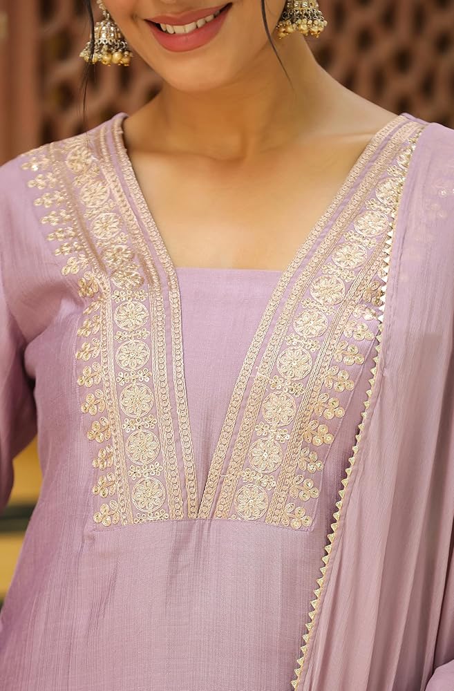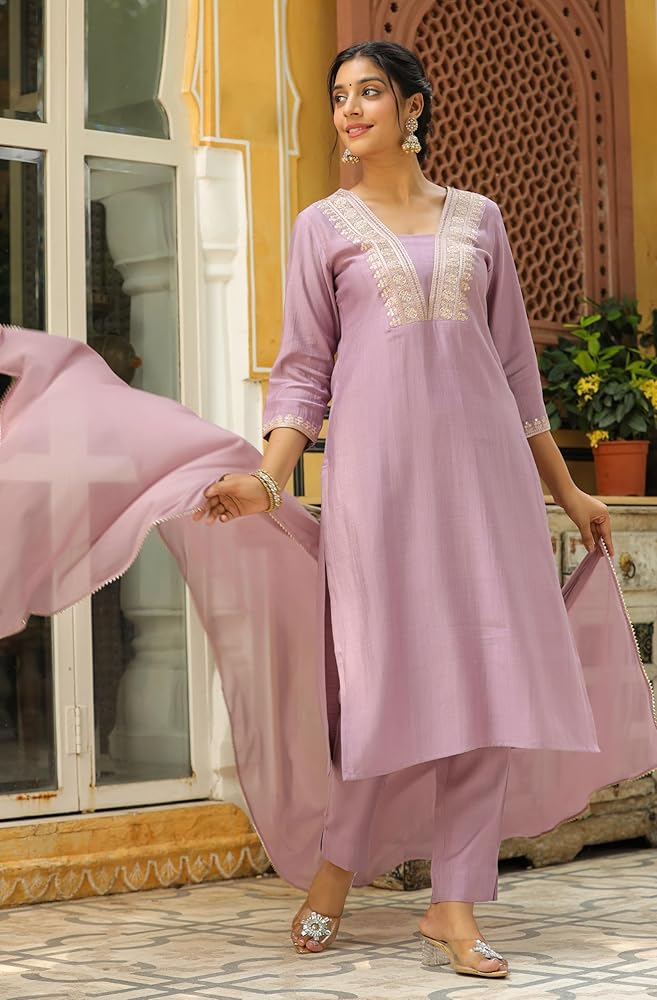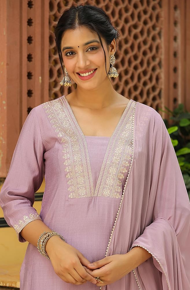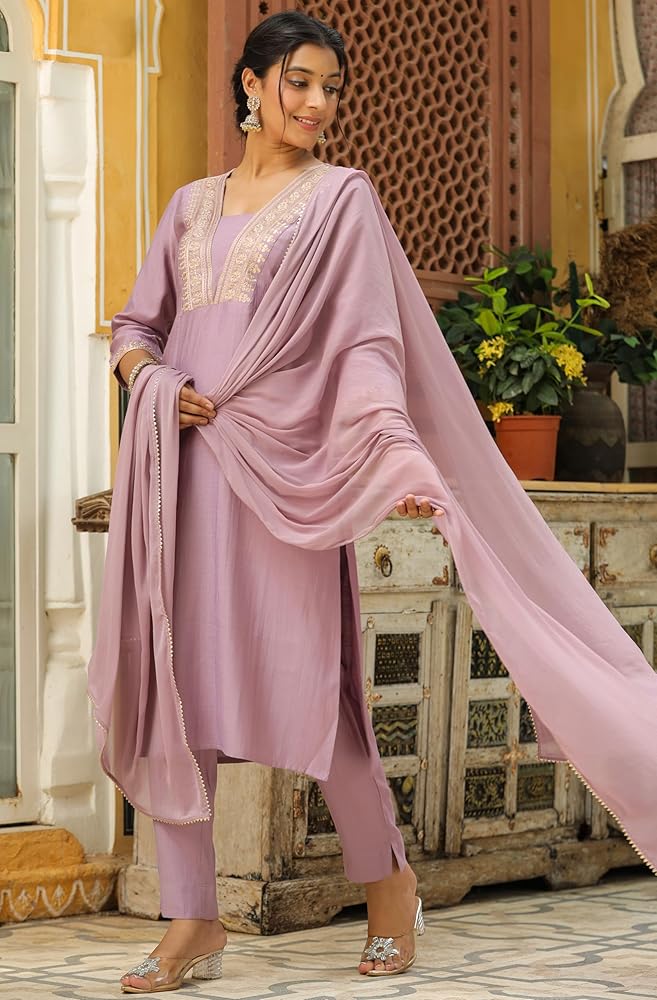 Style up your wardrobe with Janasya's Lavender Silk Blend Yoke Embroidered Straight Kurta Set with Dupatta, a must-have this festive season. Crafted from soft and breathable chinnon fabric, this ensemble is the perfect festive wear for you. The straight kurta features a V-neck supported by Zari embroidery on the yoke. Pair it up with matching narrow pants and a Naznin dupatta, adorned with lace inserts for an opulent look.