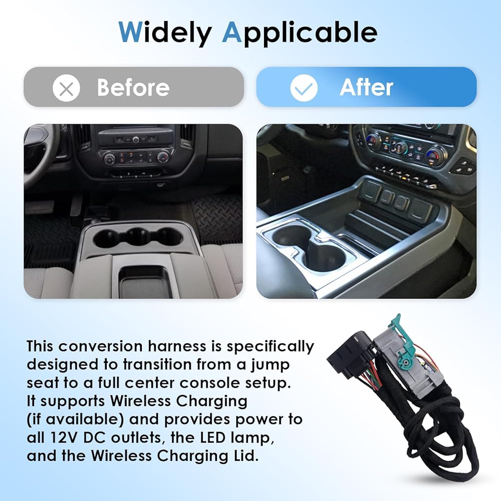 【Widely Applicable】This conversion harness is specifically designed to transition from a jump seat to a full center console setup. It supports Wireless Charging (if available) and provides power to all 12V DC outlets, the LED lamp, and the Wireless Charging Lid.