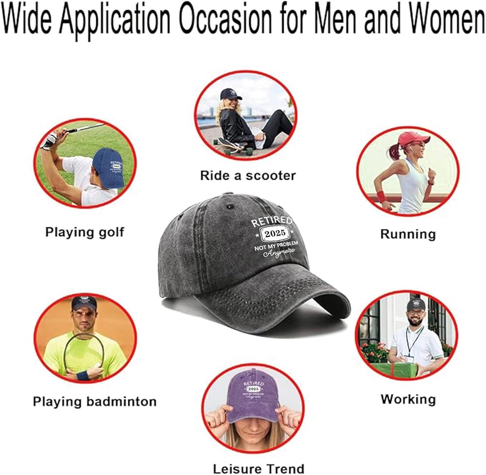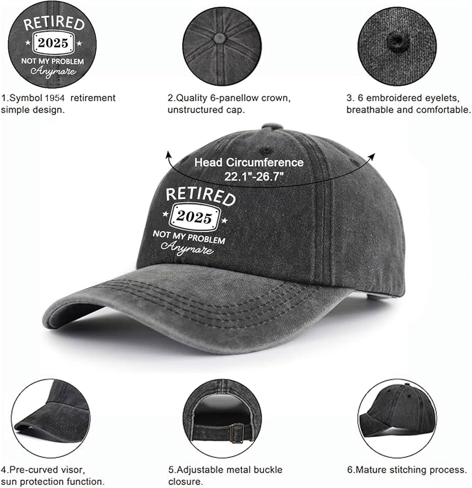 Happy Retirement Gifts - Make our retirement hat 2025 your daily wear. It's great for a bad hair day, a sunny morning or when enjoying outdoor activities like ball games,jogging,aerobics,dog walking,cycling,hiking, biking,fishing, camping, running and weekend getaway;With heavy top stitching and four rows of stitching on the brim, this letters cap promises longevity and resilience.