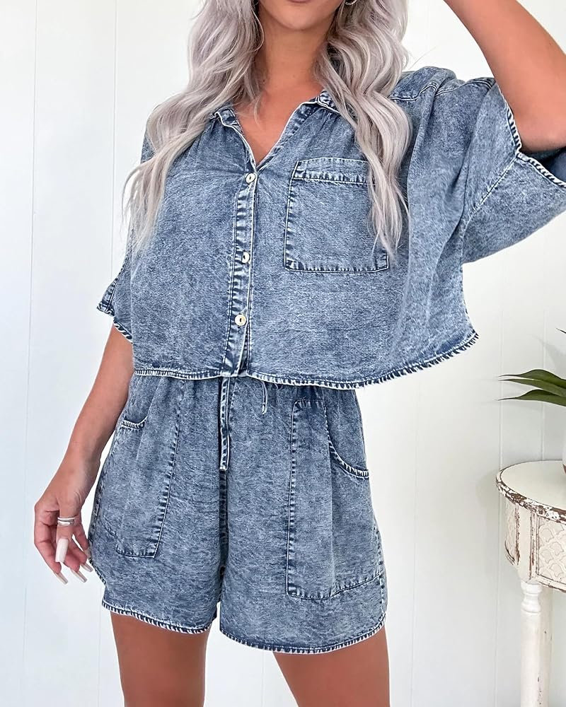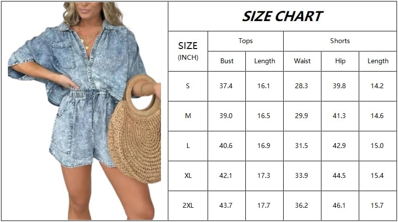 【تصميم أنيق】تتميز المجموعة النسائية الكاجوال الفضفاضة المكونة من قطعتين بأكمام قصيرة وأزرار سفلية من الدنيم، تتماشى مع السراويل القصيرة ذات الخصر العالي والقابلة للتمدد، ولون ثابت، وفضفاض، وجيوب متعددة تجعل مجموعات الصالة هذه عملية وأنيقة. طقم البيجامة للسيدات المكون من قطعتين مثالي للمرأة التي ترغب في الحفاظ على الحرية والراحة طوال الوقت. خيارك الأفضل!