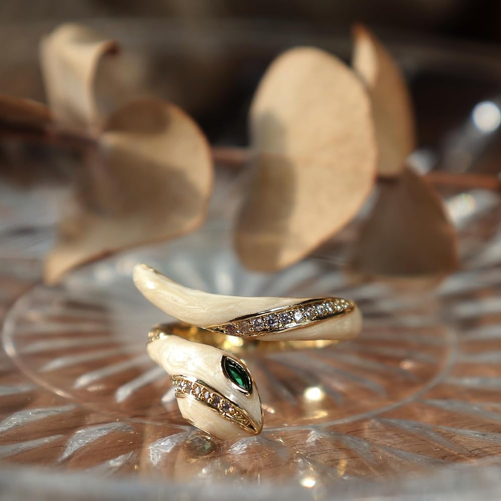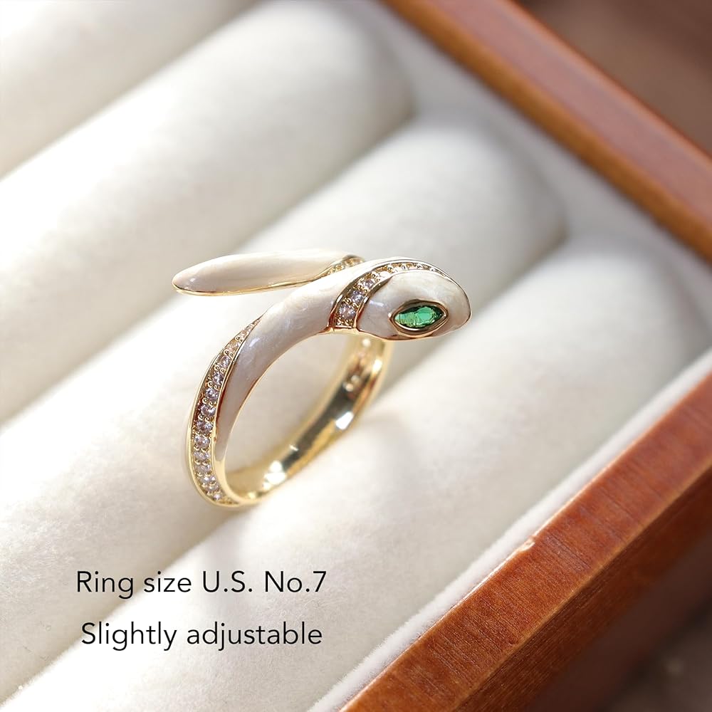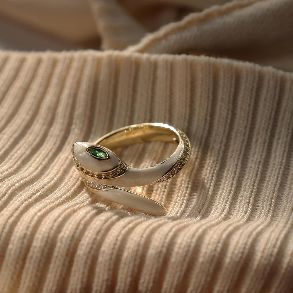 Elegant chunky gold CZ finger ring, snake shape with emerald eyes design, bold and eye-catching, adding a touch of personalization and elegance to your outfuit, chic accessory for both daily casual and formal events.