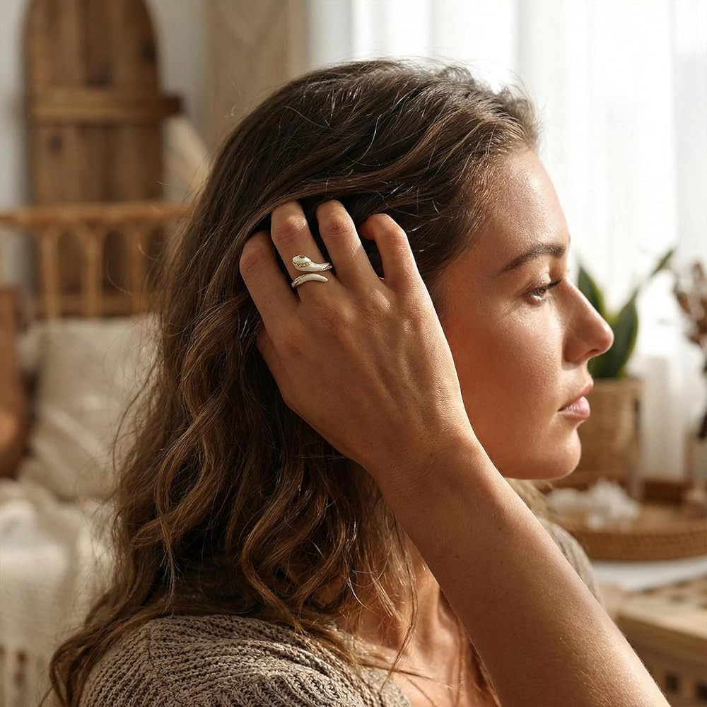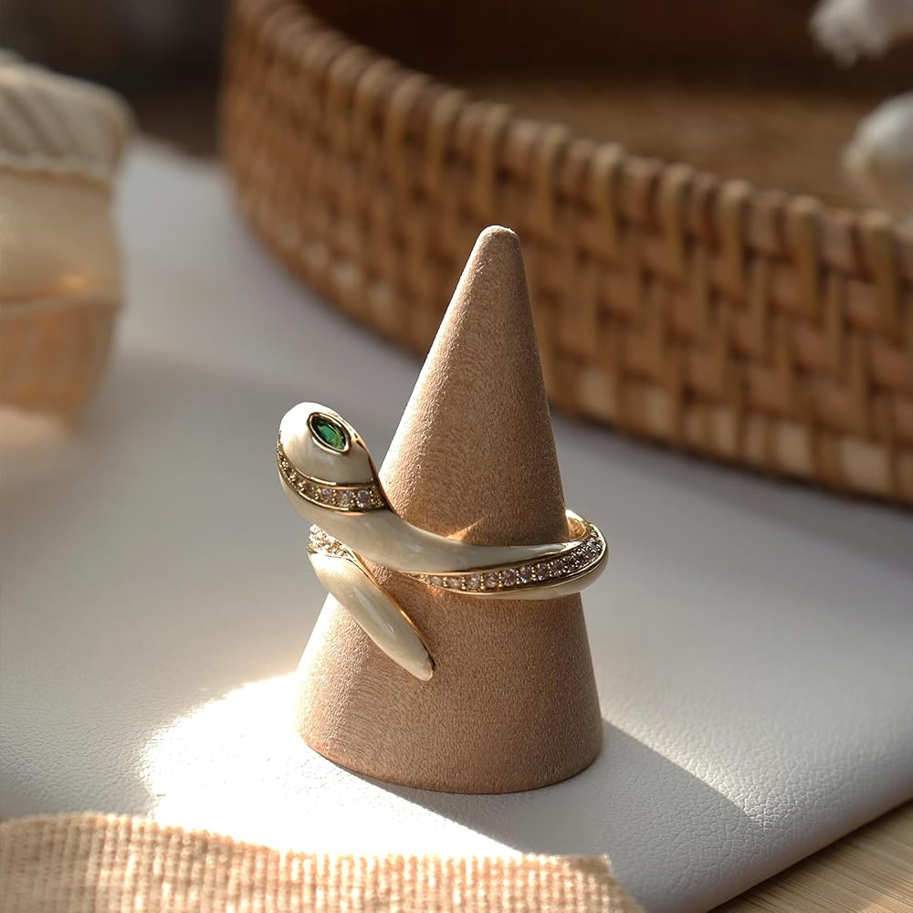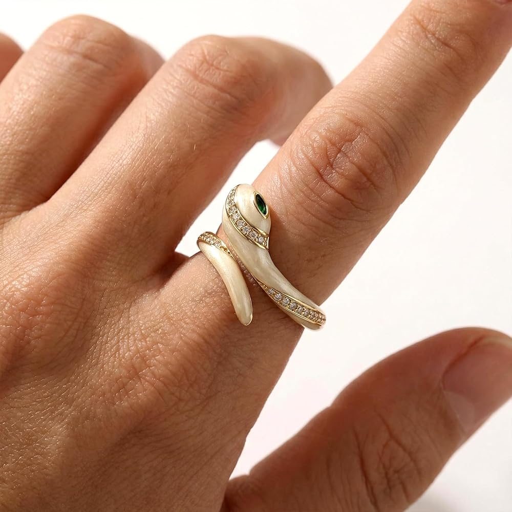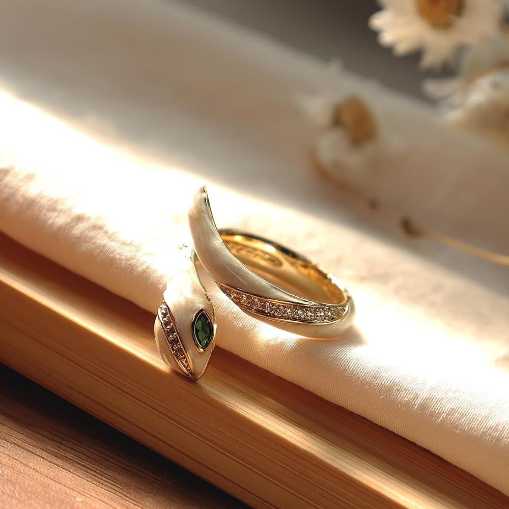 Elegant chunky gold CZ finger ring, snake shape with emerald eyes design, bold and eye-catching, adding a touch of personalization and elegance to your outfuit, chic accessory for both daily casual and formal events.