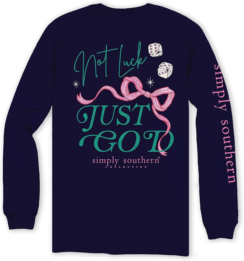 Embrace the divine power of faith with this stylish long sleeve shirt. The bold "Not Luck, Just God" design featuring a whimsical pink bow and dice motif makes a statement about relying on a higher power. Crafted from premium materials, this comfortable top from the Simply Southern Collection is perfect for casual wear. The sleeves feature the brand's name, adding a touch of Southern flair. Whether you're running errands or enjoying a night out, this shirt will keep you looking fashionable while expressing your spiritual beliefs. Available in a range of sizes to suit your preference.