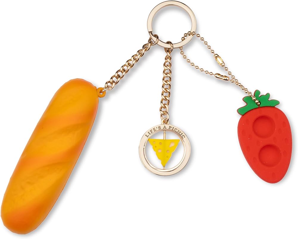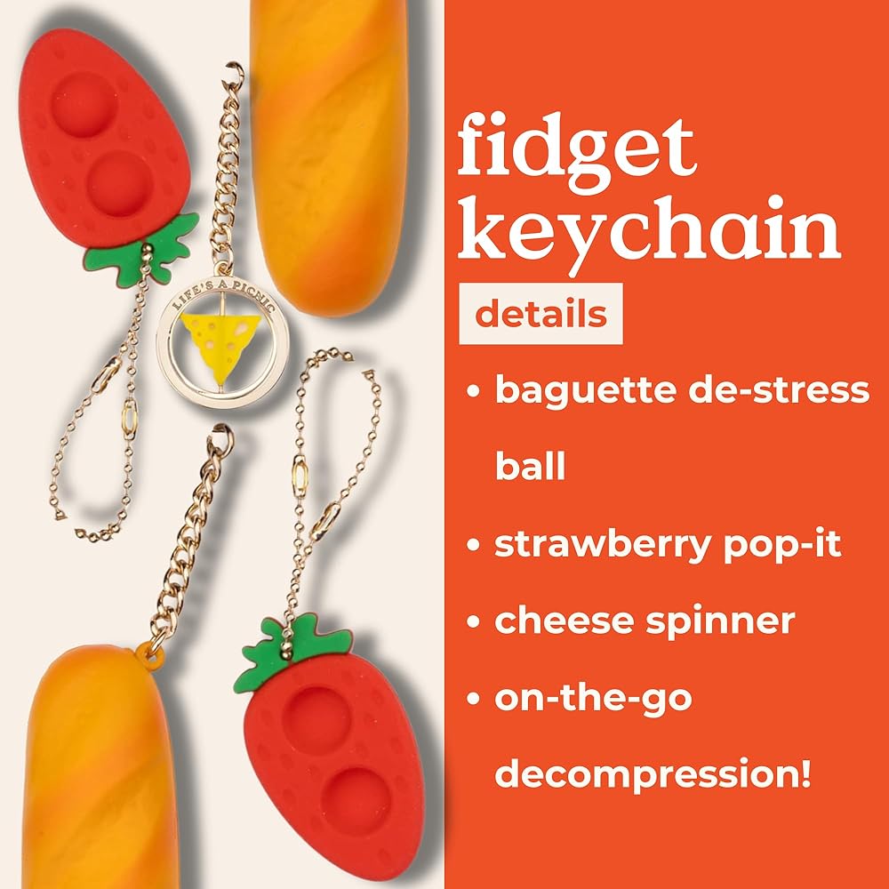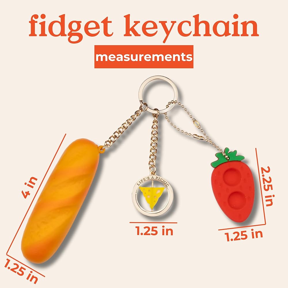 Eat your heart out, all other keychains! This one comes with a strawberry pop-it fidget, a cheese spinner fidget, and a baguette de-stress ball. The key ring is made of a sturdy metal, the de-stress baguette measures 1.25" x 4, the vibrant strawberry pop it measures 1.25" x 2.25", and the smooth cheese theme spinner measures 1.25" x 1.25". THIS ITEM IS INTENDED FOR ADULT USE ONLY.