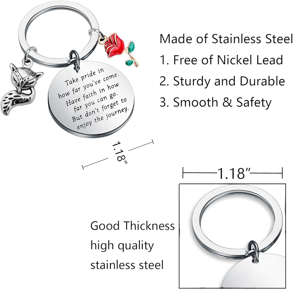 MATERIAL&SIZE: This fox and rose keychain is crafted of high polish stainless steel. As it is hypoallergenic, no harm to health and very durable suitable for treasure. Key chain pendant 1.18 inches diameter. keyring diameter: 1.18 inches.