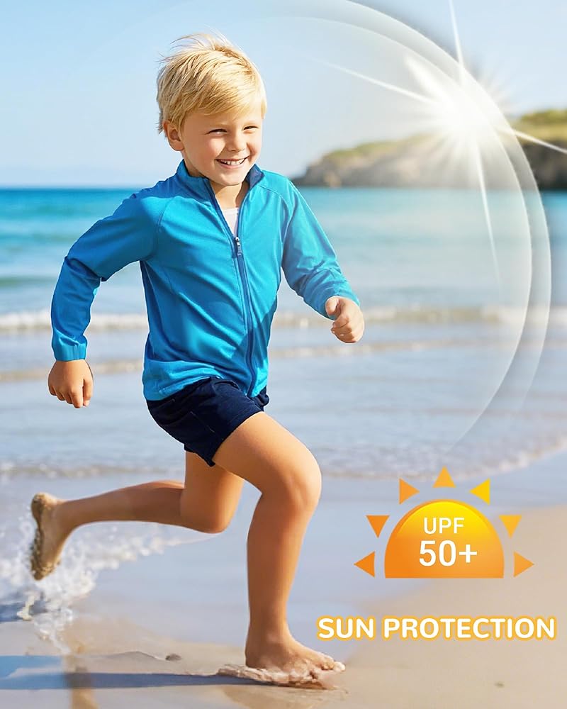 حماية عالية الكفاءة من أشعة الشمس: واقي الطفح الجلدي الخاص بنا للأولاد مصنوع من أقمشة احترافية واقية من الشمس مع مستويات حماية ممتازة بعامل حماية من أشعة الشمس 50+، والتي يمكنها حجب الأشعة فوق البنفسجية بشكل فعال وحماية بشرة الأطفال من أضرار أشعة الشمس.