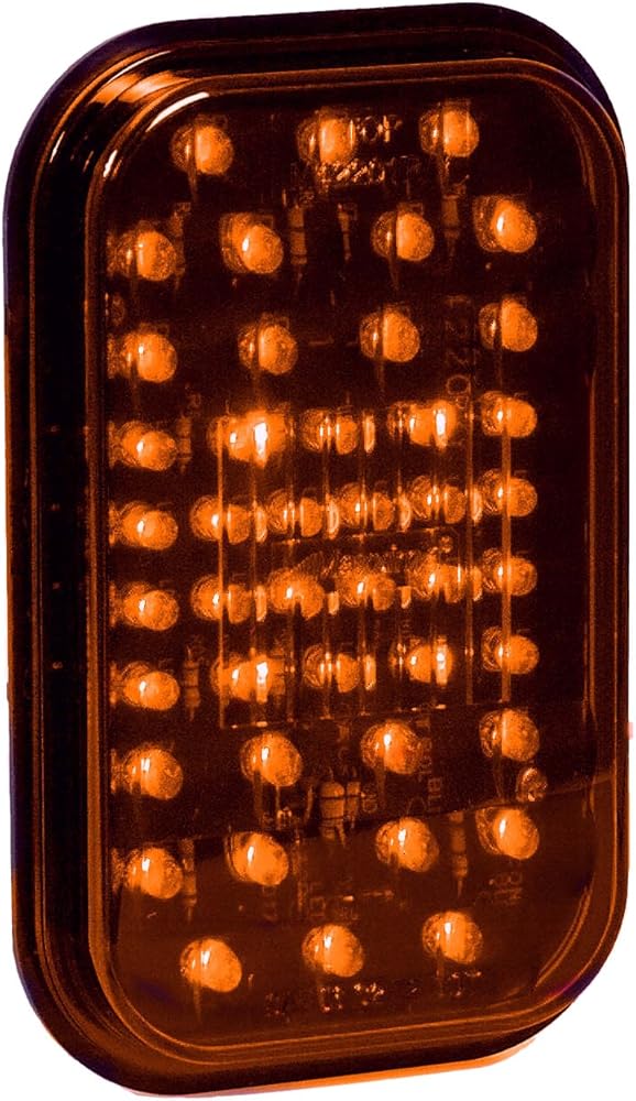 44 amber LED 5 inches rectangular Park/Turn light by Maxxima, grommet mount. LED lighting from Maxxima lasts 10 times longer than incandescent, reduces power consumption on your rig, and the high LED count allows for optimum visibility. Use with standard 3-pin connector.