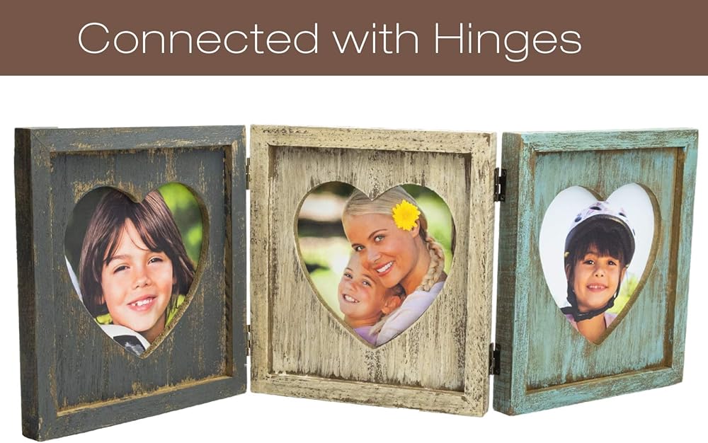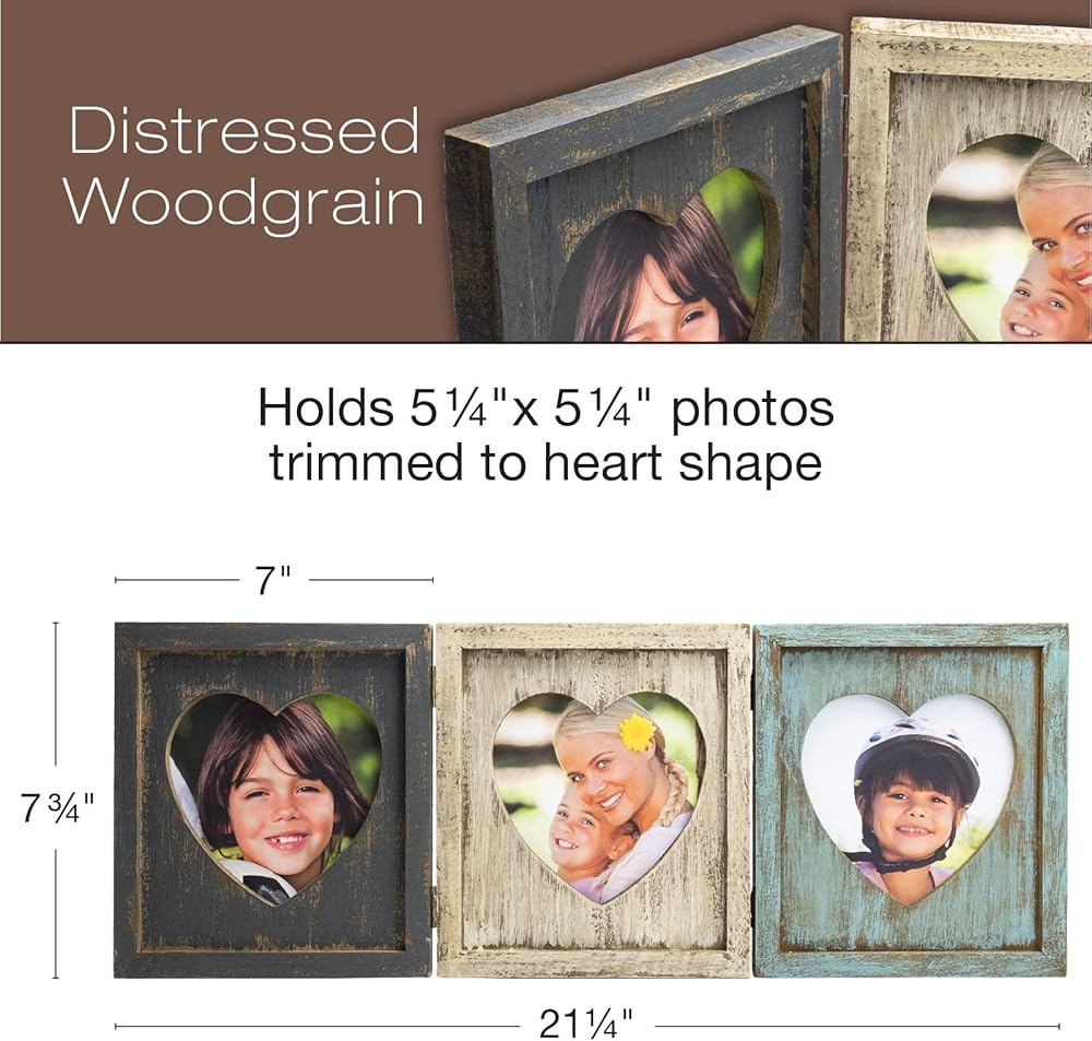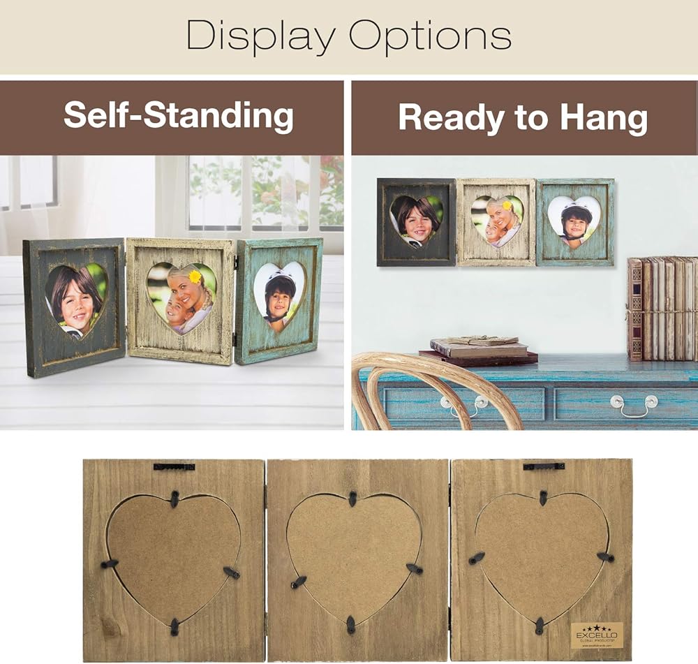 منتجات EXCELLO العالمية مجموعة صور على شكل قلب ريفي: تحمل 3 صور، مفصل قابل للطي، أنيق رث، خشب متعثر، لسطح الطاولة أو عرض الحائط. يحمل صورًا ثلاثية مقاس 5.25 × 5.25 بوصة