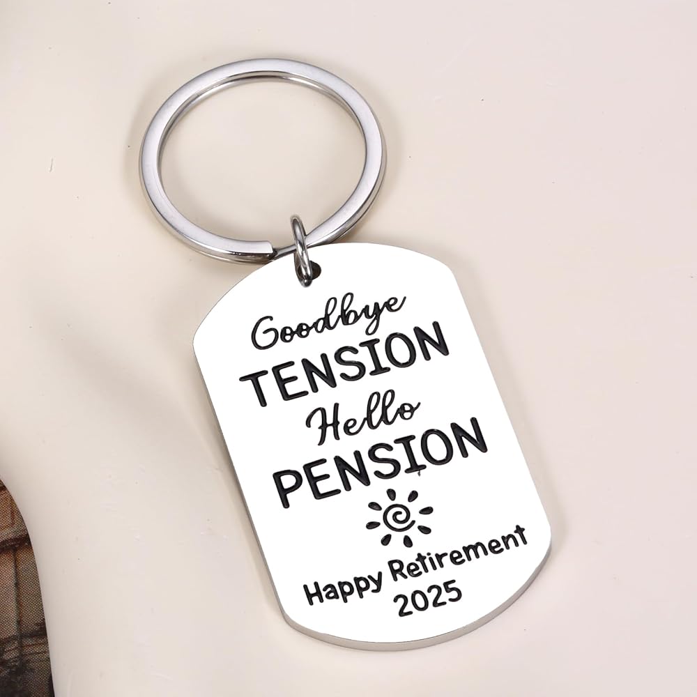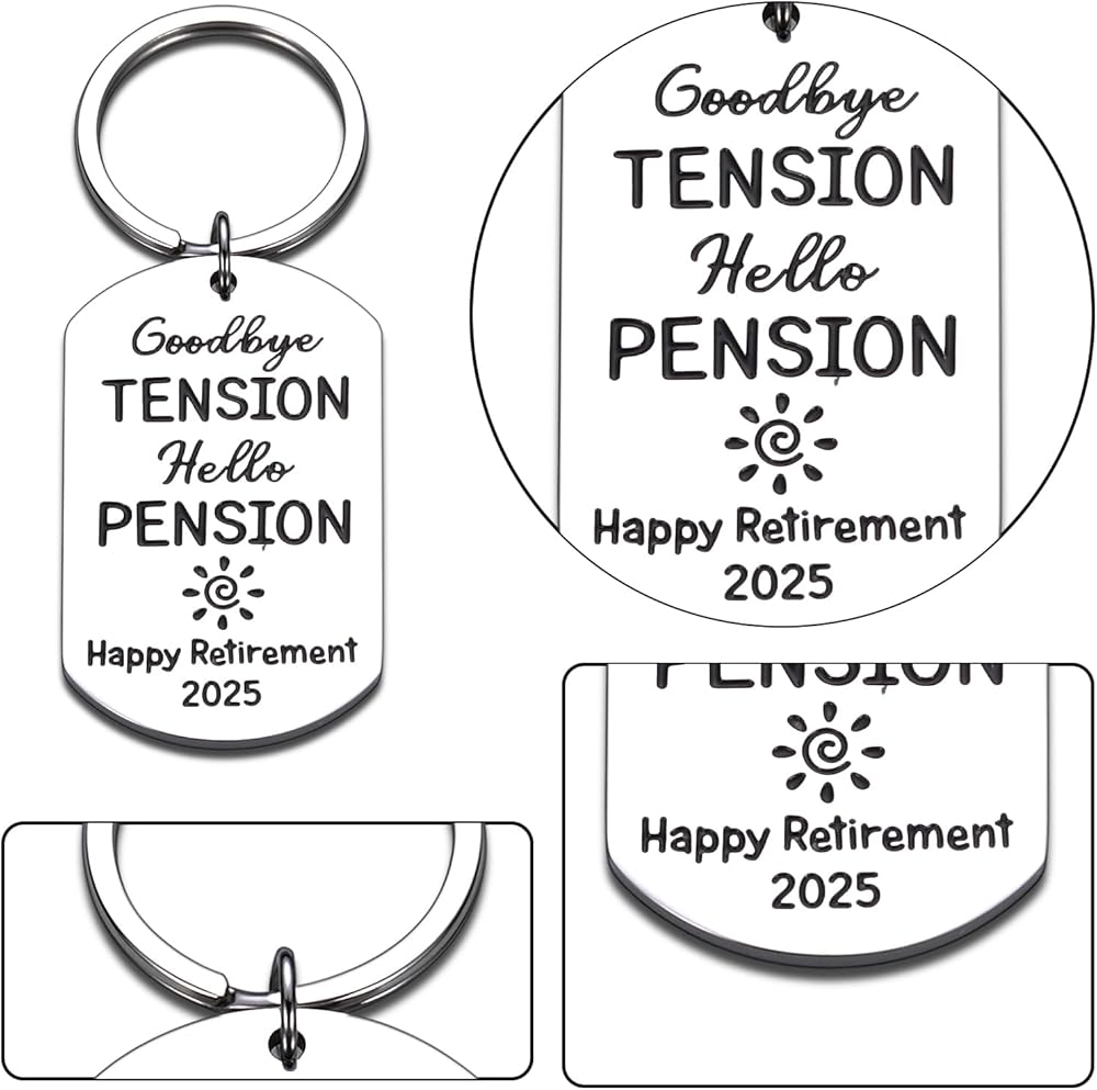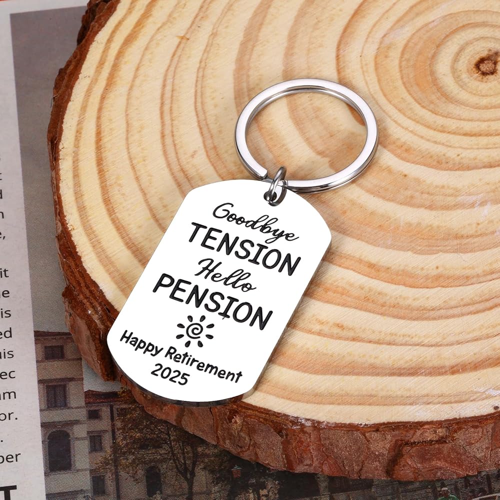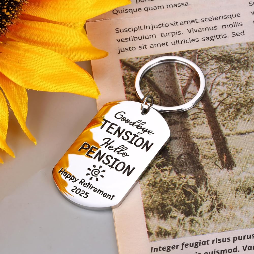 This keychain features an inspiring "goodbye tension hello pension happy retirement 2025" message, making it an ideal going away gift for coworker, friends, colleague, boss, and employee who are retiring or leaving.