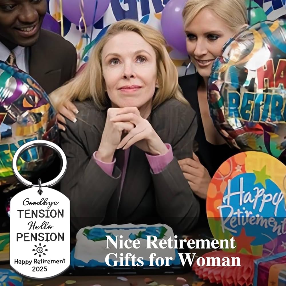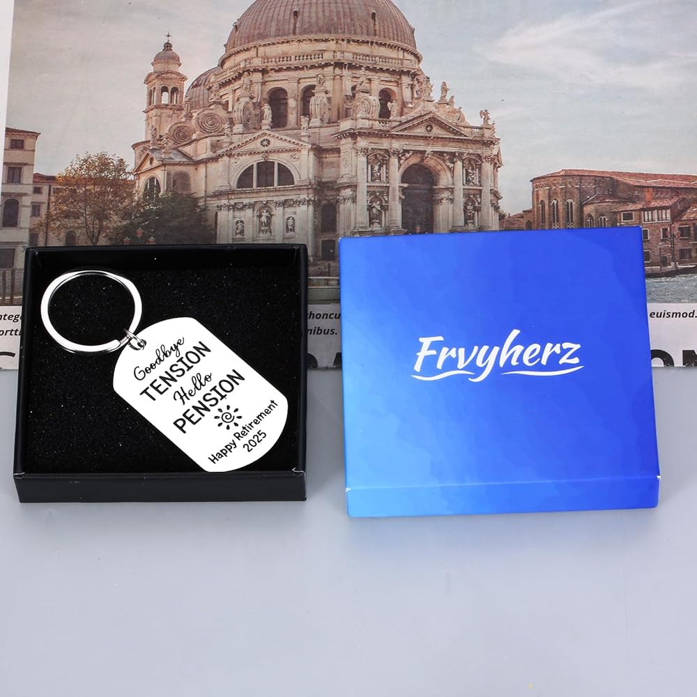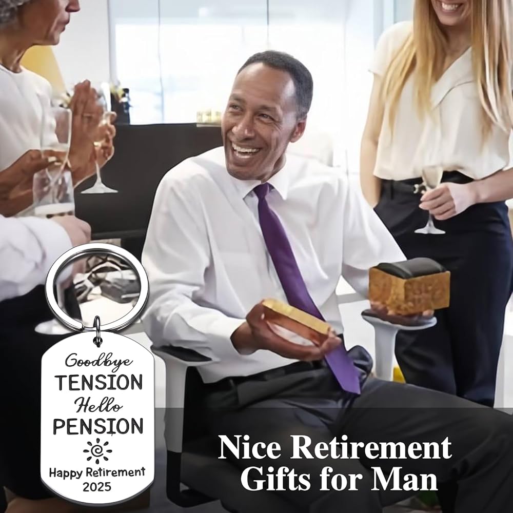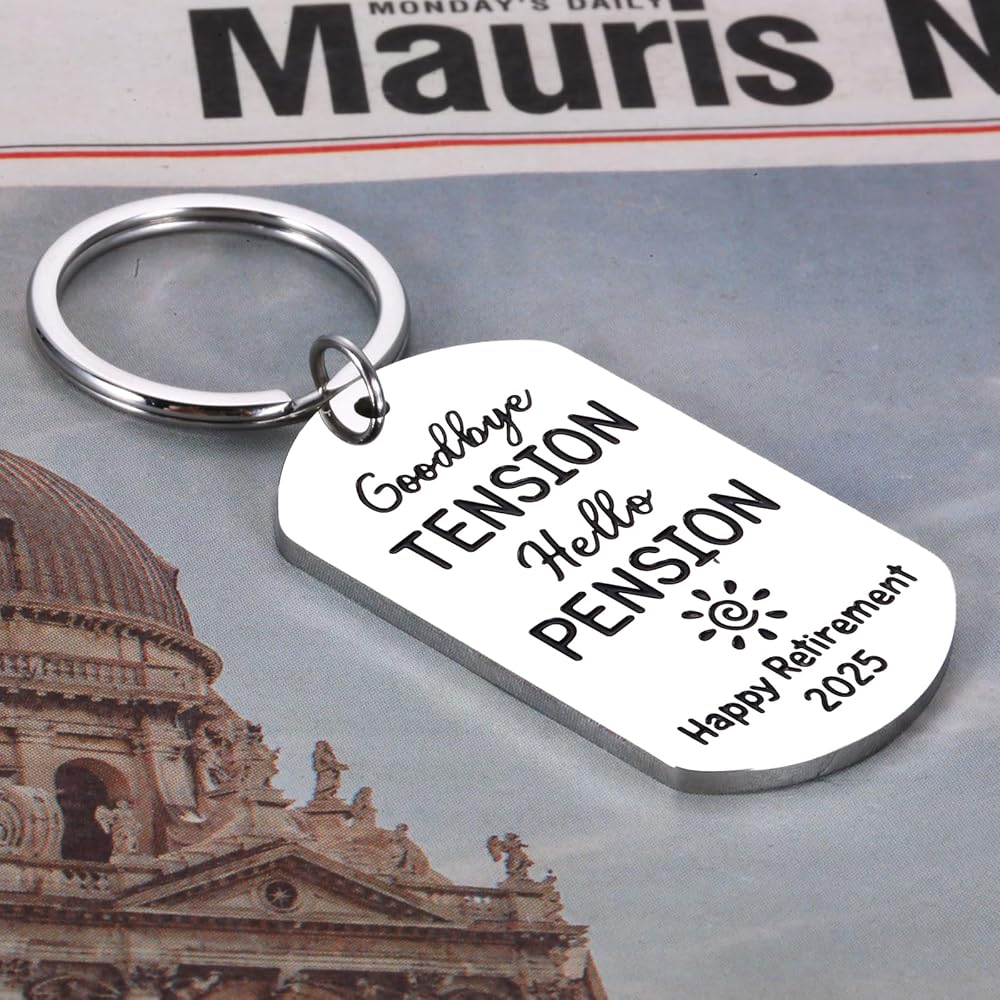 This keychain features an inspiring "goodbye tension hello pension happy retirement 2025" message, making it an ideal going away gift for coworker, friends, colleague, boss, and employee who are retiring or leaving.